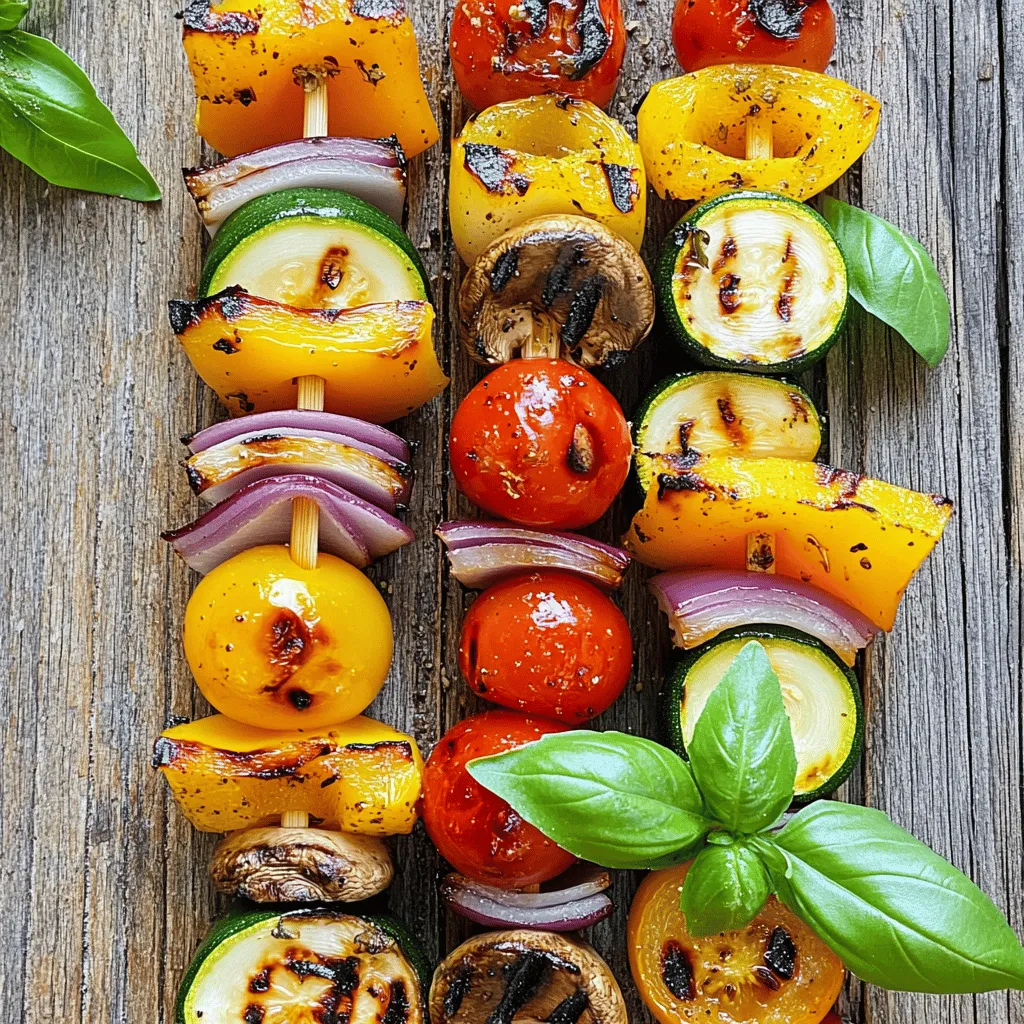 Place your skewers on the hot grill. Cook for about 10-12 minutes. Turn them occasionally to get even cooking. You want tender veggies with nice grill marks. This step adds a smoky flavor. Once grilled, let them rest for a couple of minutes. Garnish with fresh basil for a burst of flavor before serving!