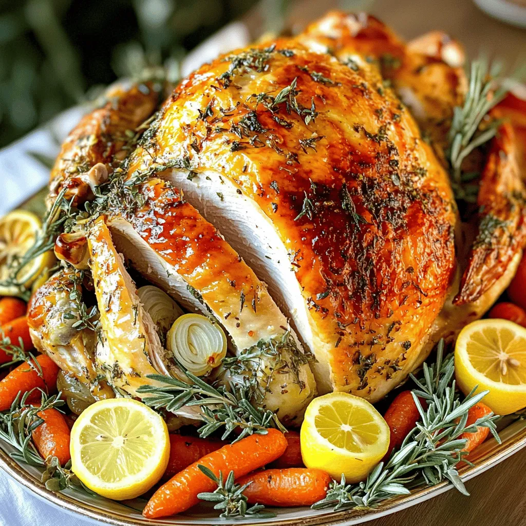 ![The Herb Garlic Butter Roasted Turkey is a standout dish for any feast. This recipe uses fresh herbs and garlic to create a rich flavor. You can find the complete recipe above. For this turkey, you need: - 1 whole turkey (about 12-14 pounds), thawed - 1 cup unsalted butter, softened - 6 cloves garlic, minced - 2 tablespoons fresh rosemary, finely chopped - 2 tablespoons fresh thyme, finely chopped - 2 tablespoons fresh sage, finely chopped - 1 lemon, zested and halved - 2 teaspoons salt - 1 teaspoon black pepper - 4 cups low-sodium chicken broth - 1 onion, quartered - 2 carrots, cut into large pieces - Fresh herbs for garnish (rosemary, thyme, sage) These ingredients bring out the best in the turkey. The butter helps keep it moist, while the herbs add depth. You might want to add a few things for extra taste: - Garlic powder for a stronger garlic flavor - Smoked paprika for a hint of smokiness - Fresh parsley for a pop of color - A splash of white wine in the broth for added richness These extras can create unique layers in your turkey dish. Mixing and matching these options can lead to your signature flavor. First, you need to prepare the turkey. Start by taking the whole turkey out of the fridge. Let it thaw if it’s still frozen. Pat the turkey dry with paper towels. This step helps the skin get crispy. Next, gently loosen the skin on the turkey breast. Be careful not to tear it. This will allow you to add flavor right where it counts. Now it's time to make the herb garlic butter. In a mixing bowl, combine one cup of softened unsalted butter with six minced garlic cloves. Then, add two tablespoons each of fresh rosemary, thyme, and sage. Don't forget to include the lemon zest and two teaspoons of salt. Add one teaspoon of black pepper for a bit of kick. Mix everything well until it’s creamy and smooth. This butter will keep your turkey moist and flavorful. With your turkey prepped and the herb garlic butter ready, it’s time to cook. Preheat your oven to 325°F (163°C). Spread half of the herb garlic butter under the skin on the turkey breast. Rub the rest over the outside of the turkey. Next, stuff the turkey cavity with the quartered onion and halved lemon. Place the turkey breast side up on a rack in a large roasting pan. Add chopped carrots and four cups of low-sodium chicken broth to the pan. This will help keep the turkey moist. Roast the turkey, calculating about 13-15 minutes per pound. Remember to baste the turkey every 30-40 minutes. This helps lock in flavor. Remove the foil during the last hour of cooking to let the skin brown. Check the turkey's doneness by using a meat thermometer. It should reach 165°F (74°C) in the thickest part of the breast and thigh. Once done, let the turkey rest for at least 30 minutes before carving. This ensures the juices stay in the meat. For the full recipe, check out the complete guide. Enjoy your flavorful feast! Basting your turkey adds flavor and helps keep it moist. Start by using the pan juices. Every 30 to 40 minutes, carefully spoon the juices over the turkey. Make sure to get the breast and the legs. This helps create a nice, golden skin. You can also use a baster for even easier basting. To keep your turkey juicy, use a few tricks. First, do not skip the herb garlic butter under the skin. This method locks in the flavors. Second, add broth to the roasting pan. The steam will help keep the turkey moist. Lastly, cover the turkey with foil during the first part of cooking. Remove it in the last hour for crisp skin. Resting is key for juicy turkey. Once you take it out of the oven, let it sit for at least 30 minutes. This step allows the juices to settle. If you cut too early, the juices will run out. After resting, carve your turkey and serve. For the full recipe, check the details provided above. {{image_2}} If you want to switch up the herbs, you have many options. Try using fresh parsley for a milder flavor. Oregano also adds a nice twist. If you like a bit of heat, add some crushed red pepper flakes. You can mix and match herbs based on your taste. Just remember to keep the measurements similar to the original recipe. Roasting gives your turkey a classic, juicy flavor. It allows the skin to crisp up nicely. Grilling, on the other hand, adds a smoky flavor that many love. If you grill, make sure to use indirect heat. This keeps the turkey moist and prevents burning. Both methods can yield great results, so choose what suits your style. The stuffing can really change the game. You can use traditional bread stuffing or try a rice-based mix for a gluten-free option. Adding fruits like apples or cranberries can bring a sweet note. Nuts like pecans or walnuts add crunch. Whatever you choose, make sure it complements the turkey well. For the complete guide, visit the [Full Recipe]. After enjoying your Herb Garlic Butter Roasted Turkey, proper storage is key. This keeps your turkey fresh and safe to eat later. Store leftover turkey in the fridge. Use airtight containers or wrap it tightly in foil. Make sure to keep the turkey in the coldest part of the fridge. Enjoy it within three to four days for the best taste. If you plan to eat it later, shred or slice it first. This helps it cool faster and stay fresh longer. Freezing is a great way to save turkey for later. Wrap pieces in plastic wrap and foil. Make sure to label them with the date. You can freeze turkey for up to six months. When you want to eat it, just thaw it safely in the fridge overnight. When reheating turkey, do it slowly. Heat it in the oven at 325°F (163°C) until it reaches 165°F (74°C). This keeps it moist. You can add a splash of broth or water to the pan to keep it juicy. If you want a quick option, use a microwave. Just cover it and heat in short bursts. Always check the temperature to ensure it’s hot throughout. For the complete recipe, check out the Full Recipe. Enjoy your flavorful feast! You should cook your turkey for about 13 to 15 minutes per poun