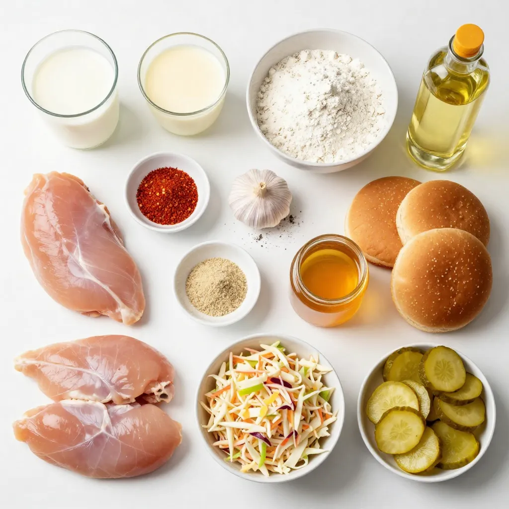 The main ingredients create a tasty base for these sandwiches. The chicken breasts soak in the buttermilk. This helps keep them tender and juicy. Brioche buns add a sweet touch. They are soft and hold up well.