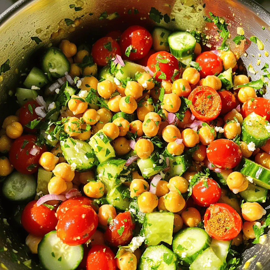Using fresh ingredients makes your salad taste great. Choose firm, ripe cherry tomatoes. Look for cucumbers that are green and smooth. Fresh parsley adds bright flavor. I love using organic produce when possible. Drain and rinse the chickpeas well for the best taste.