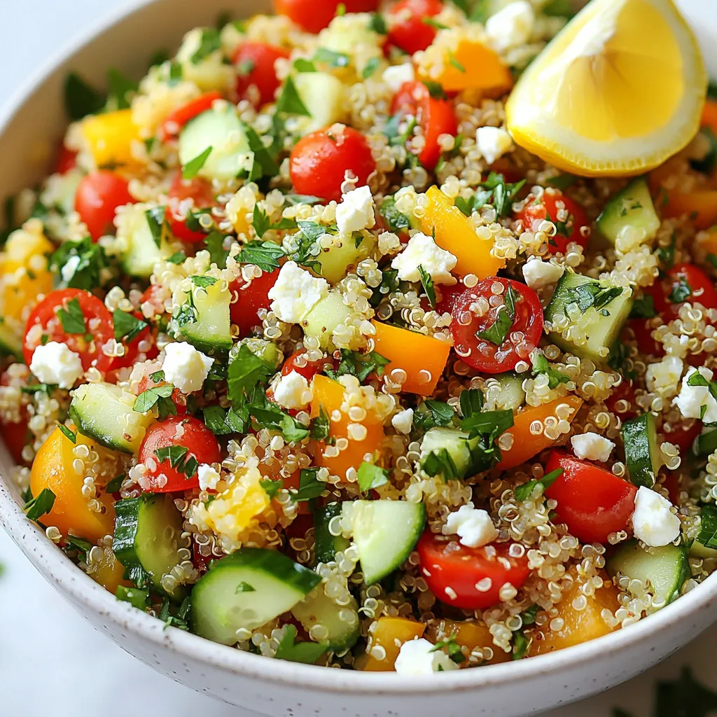 A refreshing and nutritious salad featuring quinoa, fresh vegetables, and a zesty lemon garlic dressing.
