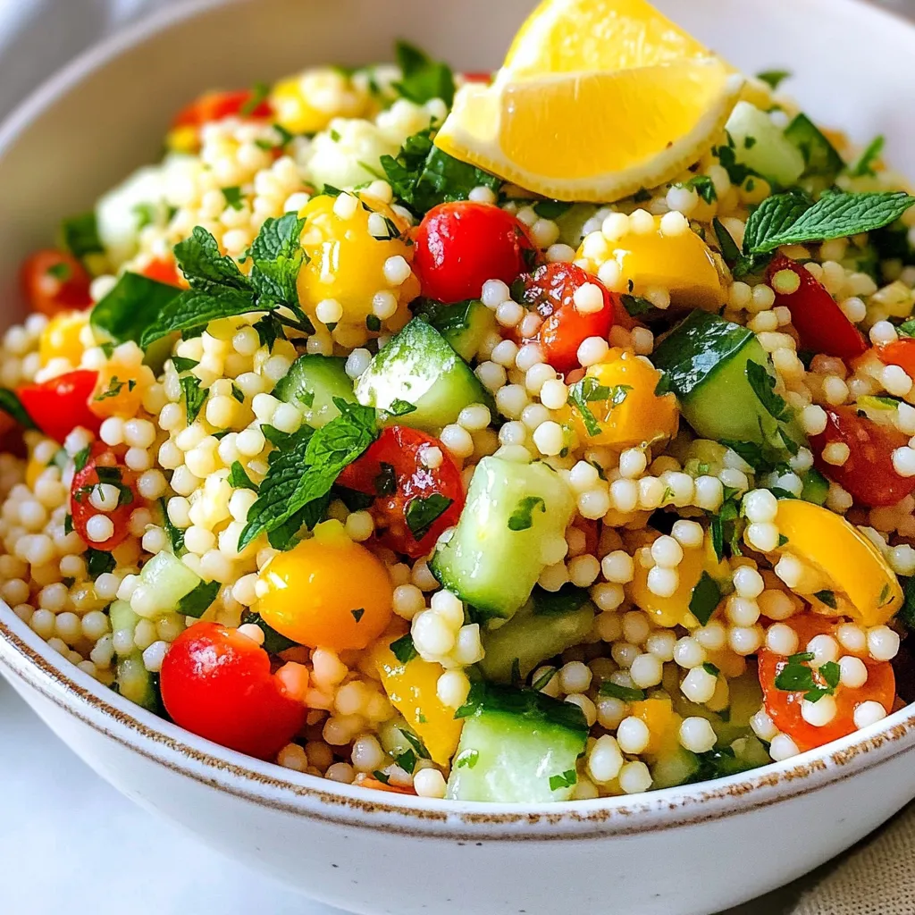 A refreshing and vibrant salad featuring couscous, fresh vegetables, and a zesty lemon dressing.