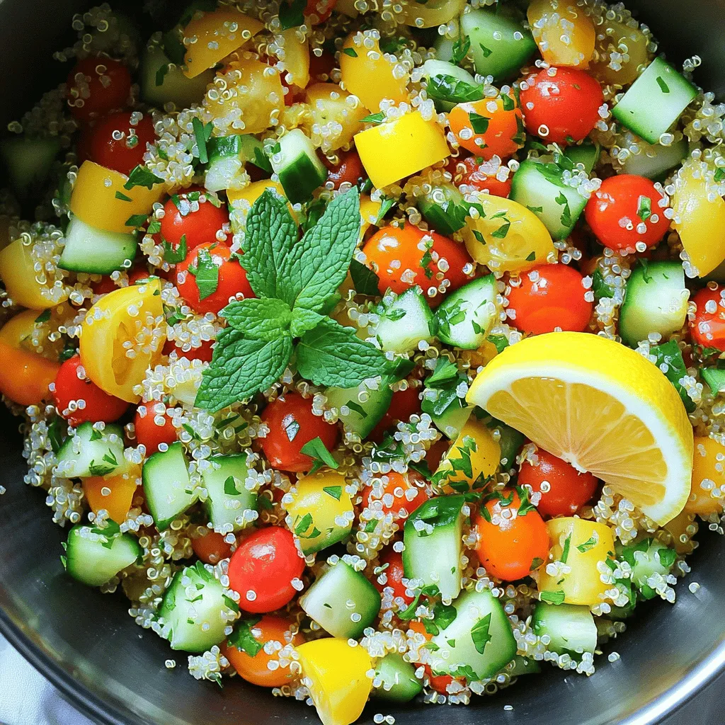 Quinoa is the star of this dish. It has a nice nutty flavor and a great texture. When cooked, quinoa becomes fluffy and light. Using vegetable broth instead of water adds rich taste. Fresh veggies like cherry tomatoes, cucumber, and bell pepper bring colors and crunch. Red onion gives a mild bite.