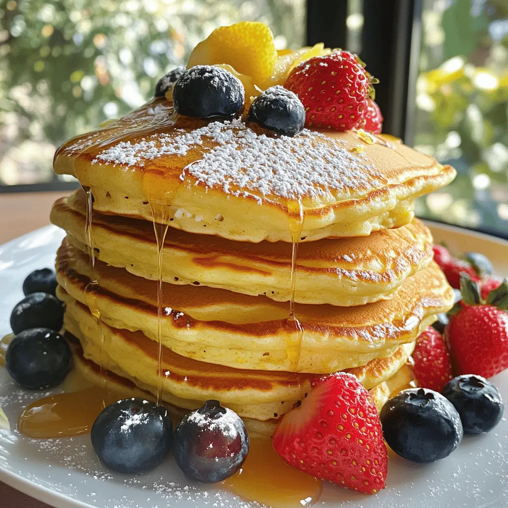 ![To make these light and fluffy pancakes, you will need: - 1 cup ricotta cheese - 2 large eggs - 1/4 cup milk - 1/4 cup fresh lemon juice - Zest of 1 lemon - 1 cup all-purpose flour - 2 tablespoons sugar - 1 tablespoon baking powder - 1/2 teaspoon salt - 2 tablespoons melted butter (plus more for cooking) - Powdered sugar for dusting - Fresh berries for serving When choosing ricotta cheese, go for fresh. It makes a big difference in taste. For the best flavor, use fresh lemons. The zest adds a bright note to your pancakes. If you want to switch things up, try these options: - Ricotta alternatives: You can use cottage cheese or mascarpone if you prefer. Both will give a creamy texture. - Dairy-free options: Substitute the ricotta with tofu or a dairy-free cream cheese. Use almond milk or coconut milk instead of regular milk. - Flavor enhancements: Add a splash of vanilla extract or a pinch of cinnamon for more flavor. Chopped herbs like mint or basil can also add a fresh twist. These variations let you customize the pancakes to fit your taste or dietary needs. Enjoy the process of making them your own! Start by mixing the wet ingredients. In a large bowl, add the ricotta cheese, eggs, milk, fresh lemon juice, and lemon zest. Whisk them together until everything is smooth. This step brings out the creamy texture of the ricotta. Now, let’s combine the dry ingredients. In another bowl, mix the flour, sugar, baking powder, and salt. Stir until these ingredients are evenly mixed. This helps the pancakes rise evenly when you cook them. Next, it's time for the cooking process. Heat a non-stick skillet or griddle over medium heat. The ideal temperature is when a drop of water sizzles on the surface. Lightly grease the skillet with butter. For each pancake, pour about 1/4 cup of batter onto the skillet. Cook until bubbles form on the surface, which takes about 2-3 minutes. When you see bubbles, it’s time to flip the pancake. Use a spatula and flip it quickly. Cook the other side for about 2 minutes until golden brown. Now for the final touches. Serve the pancakes warm. Dust them with powdered sugar for a sweet finish. Fresh berries on top add color and flavor. For plating, stack the pancakes high for a lovely display. You can also drizzle some syrup for extra sweetness. Want the full details? Check out the Full Recipe for all the steps! To avoid tough pancakes, mix the batter gently. Overmixing makes pancakes dense. You want some lumps; they help keep the pancakes light. Resting the batter is key. Let it sit for 10 minutes. This allows the flour to absorb moisture. The result is a fluffier pancake. Adding spices can boost flavor. Try a pinch of cinnamon or nutmeg. You can also add vanilla extract for depth. Get creative with toppings. Instead of just berries, think about whipped cream or honey. Sliced bananas or chopped nuts can also add a fun twist. Use a non-stick skillet for perfect pancakes. A cast-iron skillet works well, too. It holds heat evenly and gives a nice golden color. For measuring ingredients, a kitchen scale ensures accuracy. Measuring cups and spoons are great, but a scale is more precise. Use a whisk for mixing to get a nice smooth batter. For the complete recipe, check the [Full Recipe]. {{image_2}} You can change up your lemon ricotta pancakes to keep things fun. One great option is lemon poppy seed pancakes. Just add 2 tablespoons of poppy seeds to the batter. The seeds add a nice crunch. They also give a lovely look to the pancakes. Another tasty choice is blueberry lemon ricotta pancakes. Fold in a cup of fresh or frozen blueberries right before cooking. The blueberries burst and mix with the lemon flavor. This makes each bite a fruity delight. If you're gluten-free, you can still enjoy these pancakes. Use a gluten-free flour blend instead of all-purpose flour. This change will keep the pancakes light and fluffy. For those following a vegan diet, make a few easy swaps. Replace ricotta cheese with silken tofu blended until smooth. Use flax eggs instead of regular eggs. Just mix 1 tablespoon of ground flaxseed with 2.5 tablespoons of water and let it sit for 5 minutes. Finally, swap the milk with a plant-based milk like almond or oat. These small changes let you enjoy lemon ricotta pancakes in a vegan way. Check out the Full Recipe to get started on your pancake journey! To keep your lemon ricotta pancakes fresh, store them in the fridge. Place them in an airtight container or wrap them in plastic wrap. They can stay good for about three days. If you want to keep them longer, freezing is the way to go. Lay the pancakes flat on a baking sheet. Freeze them for about an hour. After that, stack them with parchment paper in between. Use a freezer bag for long-term storage. They can last up to two months in the freezer. You have a few options for reheating your pancakes. The microwave is quick and easy. Just place a pancake on a plate and cover it with a damp paper towel. Heat it for about 20 seconds. You can also use the stove. Just warm a non-stick skillet over low heat and place the pancake inside. Flip it after a minute or so. Finally, the oven works well too. Preheat your oven to 350°F (175°C). Place the pancakes on a baking sheet and cover with foil. Heat for about 10 minutes. To keep pancakes fluffy, avoid using high heat. If they get too hot, they can dry out. A gentle touch is key to keeping them light and airy. Can I make the batter ahead of time? Yes, you can make the batter ahead of time. Store it in the fridge for up to 24 hours. Just remember to stir it gently before cooking. This can save you time on busy mornings. How do I know when pancakes are done? Pancakes are done when they are golden brown and bubbles form on the surface. Cook for about 2-3 minutes on each side. If you see steam escaping, it’s a good sign they are ready to flip. What to do if pancakes are too dense? If your pancakes are too dense, try adding a little more milk. This will help lighten 