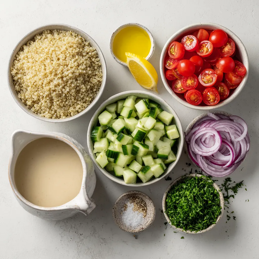 In a large mixing bowl, combine the cooled quinoa, diced cucumber, halved cherry tomatoes, chopped red onion, and parsley.