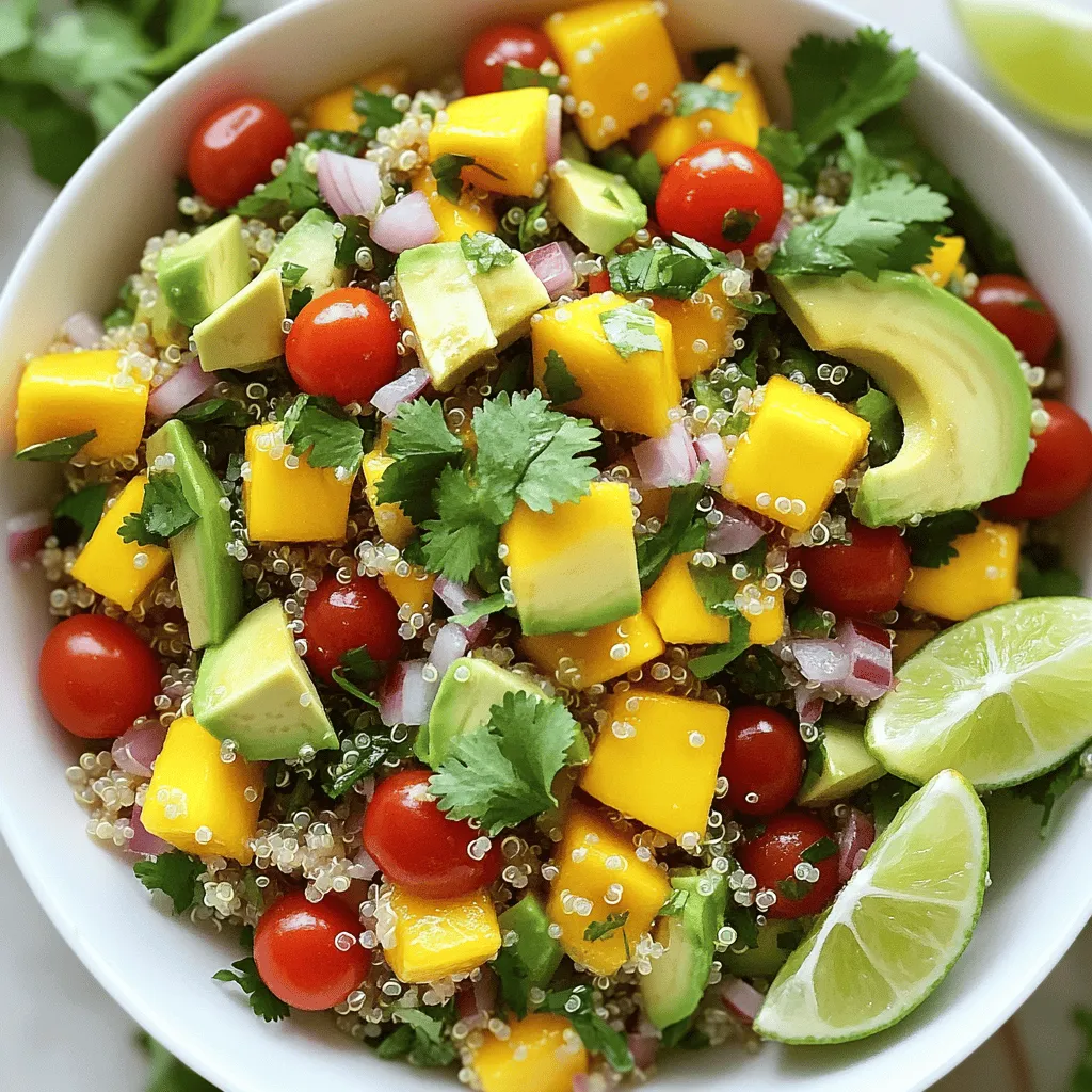 ![- Quinoa and Cooking Liquid Options - 1 cup quinoa, rinsed - 2 cups water or vegetable broth Quinoa is the star of this salad. It adds a nice nutty flavor and full texture. You can use water for a lighter taste or vegetable broth for a richer flavor. - Fresh Produce for Flavor and Texture - 1 ripe mango, diced - 2 ripe avocados, diced - 1 cup cherry tomatoes, halved - 1/4 cup red onion, finely chopped - 1/4 cup fresh cilantro, chopped Mango and avocado bring creaminess and sweetness. Cherry tomatoes add a pop of color and juiciness. Red onion gives a slight bite. Fresh cilantro ties it all together with a bright taste. - Dressing Ingredients for Enhanced Taste - 1 tablespoon lime juice - 1 tablespoon olive oil - Salt and pepper to taste - Optional: 1/2 jalapeño, minced (for a spicy kick) The dressing is simple but powerful. Lime juice adds acidity. Olive oil brings richness. Salt and pepper enhance the flavors. If you want more heat, add jalapeño for a nice kick. This recipe makes a fresh and flavorful dish. Find the Full Recipe above to guide you through every step. To start, you need to rinse the quinoa. This helps remove any bitter taste. Use a fine-mesh strainer and rinse it under cold water for about a minute. After rinsing, combine the quinoa and water (or broth) in a medium saucepan. Bring this mixture to a boil over high heat. Once it boils, reduce the heat to low. Cover the pot and let it simmer for about 15 minutes. You want the liquid to absorb completely. When done, take it off the heat and let it cool for a few minutes. Fluff the quinoa with a fork for the perfect texture. Next, grab a large bowl to mix the salad. Add the fresh diced mango, avocado, halved cherry tomatoes, chopped red onion, and cilantro. These ingredients bring a burst of flavor and color. Then, gently fold in the cooked quinoa. Be careful not to mash the avocado; you want it to stay chunky and fresh. Now it’s time for the dressing. In a small bowl, whisk together lime juice, olive oil, salt, and pepper. This simple dressing adds brightness to your salad. Taste it and adjust the seasoning as needed. If you like heat, fold in minced jalapeño for a spicy kick. Pour the dressing over the salad and toss gently to coat all the ingredients. You can find the full recipe [here]. Preparing ingredients ahead of time makes cooking easy. Chop up your mango, avocado, and veggies in advance. You can store them in airtight containers. Keep each ingredient separate to prevent browning. When you store prepped ingredients, use the fridge. This keeps them fresh for a few days. For avocados, sprinkle lime juice to slow browning. This simple trick keeps them vibrant and green. To boost flavor, consider adding a few spices. A pinch of cumin or chili powder can add depth. You can also try a dash of smoked paprika for a unique twist. If you want it spicier, add more jalapeño. You can also use red pepper flakes. For a milder taste, skip the jalapeño or add a little honey for sweetness. Serving your salad in beautiful bowls makes it special. Use white or colorful dishes to showcase the vibrant colors. Layer the ingredients for a nice visual effect. For garnishing, add extra cilantro leaves and lime wedges on top. This adds a fresh look and extra flavor. Enjoy this feast for the eyes as much as for the taste! This salad is not just tasty; it’s also a feast of colors. Try the full recipe for a delightful meal! {{image_2}} You can make this salad heartier by adding protein. Grilled chicken is a great choice. Just slice it thinly and mix it in. If you want a vegan option, try tofu. - Grilled Chicken: Cook it on a grill or stovetop. Slice it and add it to the salad. - Tofu: Press it to remove extra water. Cube and sauté until golden. Add it to the salad. - Legumes: You can also add canned beans like black beans or chickpeas. They add protein and fiber. The beauty of this salad is its adaptability. You can change the fruits based on what is in season. - Substituting Fruits: Try peaches in summer or pomegranate seeds in winter. Both add a unique taste. - Adjusting Ingredients: Use fresh herbs like basil or dill when they are in season. This change can give the salad a fresh twist. This salad is easy to modify for different diets. You can keep it gluten-free and vegan easily. - Gluten-Free: Quinoa is naturally gluten-free. Ensure your other ingredients are too. - Vegan Options: Replace honey or any animal products in dressings with plant-based options. - Modifying for Allergies: If you are allergic to avocados, try using nuts or seeds instead. For the full recipe of Mango Avocado Quinoa Salad, check out the details above! To keep your mango avocado quinoa salad fresh, use airtight containers. Glass or BPA-free plastic works well. These containers seal tightly, keeping air out. This helps slow down spoilage. When storing, keep the dressing separate. This keeps the salad from getting soggy. You can store the dressing in a small jar. Just shake it before using. When stored correctly, this salad lasts about 3 days in the fridge. However, the avocado can brown quickly. Check for signs of spoilage, like a sour smell or slimy texture. If you see these signs, it’s best to toss it. You can serve leftovers cold or at room temperature. If you want to warm it up, use the microwave. Heat it in short bursts to avoid cooking the avocado. You can also transform the salad into new dishes. Mix it into a wrap or add it to a grain bowl. This way, you can enjoy the flavors in different ways. For the detailed recipe, check the Full Recipe. Yes, you can make this salad ahead of time. It tastes great after chilling in the fridge. - Cook the quinoa and let it cool. - Chop the mango, avocado, and veggies. - Mix everything a few hours before serving. To keep the salad fresh, store the dressing separately. Combine it just before serving. This step helps keep the avocado from browning. If you want a change, you can use other grains. Brown rice or farro wo