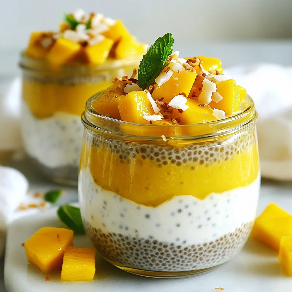 These ingredients create a rich and creamy pudding. Coconut milk gives it a smooth texture and a lovely taste. The chia seeds thicken the pudding and add a nice crunch. You can use maple syrup or honey for sweetness, according to your taste. The ripe mango adds freshness and a burst of flavor. A hint of vanilla and a pinch of salt round out the taste perfectly. To make it look beautiful, top your pudding with toasted coconut flakes and fresh mint leaves. This dish is not only delicious; it is also visually appealing.