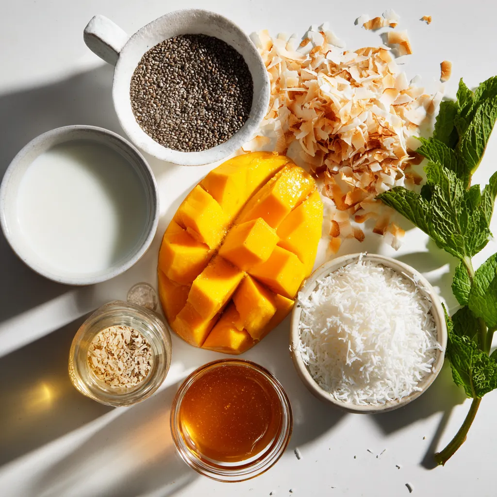 To make Mango Coconut Chia Pudding, you need simple and fresh ingredients. Here’s what you will need: