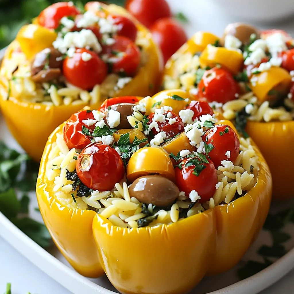 Delicious bell peppers stuffed with orzo pasta, vegetables, and feta cheese, baked to perfection.