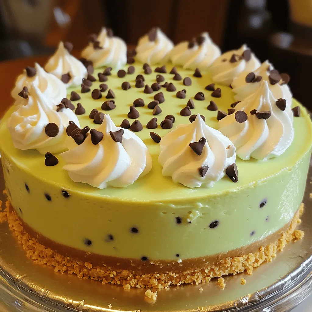 When I make Mint Chocolate Chip Cheesecake, I always choose the best ingredients. The crust starts with graham cracker crumbs mixed with melted butter. This gives it a rich flavor and nice crunch.