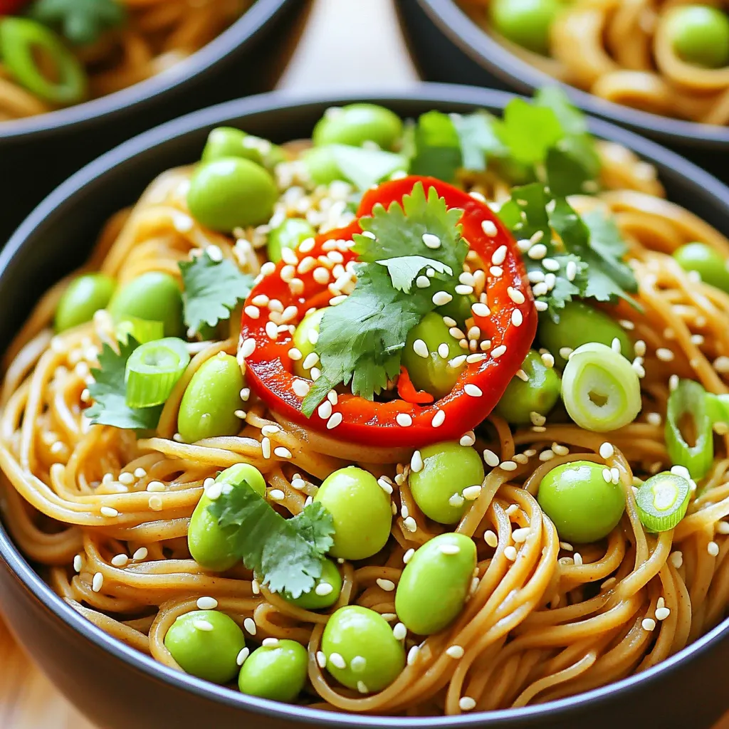 Start by boiling a large pot of salted water. Add 8 oz of soba noodles. Cook them for about 4-5 minutes. Check the package for exact times. When the noodles are done, they should be tender but firm. In the last 2 minutes of cooking, add 1 cup of shelled edamame. This adds great color and protein. Drain the noodles and edamame well. Rinse them under cold water to stop the cooking process.