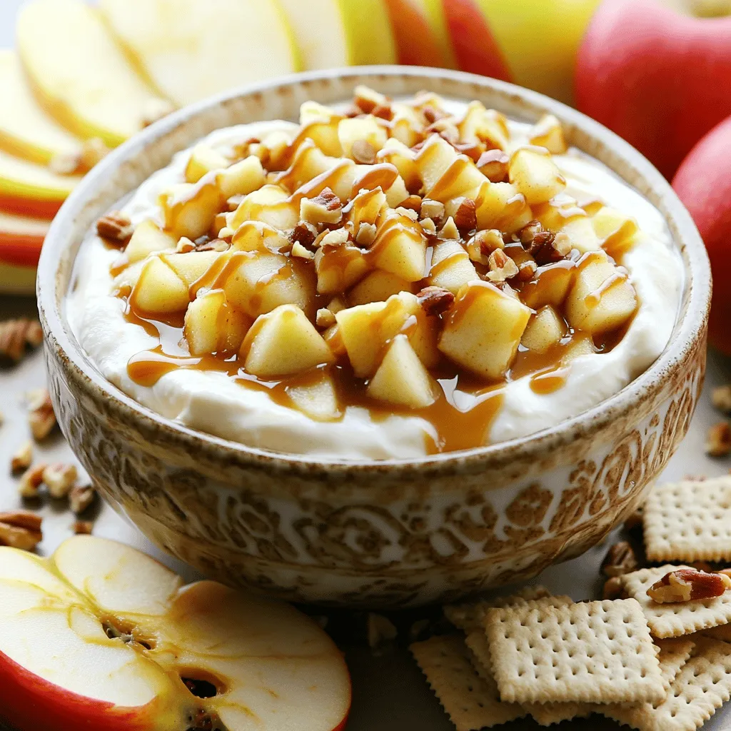The dip lasts well in the fridge for about three days. However, the apples may brown slightly over time. To slow this, you can toss the diced apples in lemon juice before adding them to the dip.