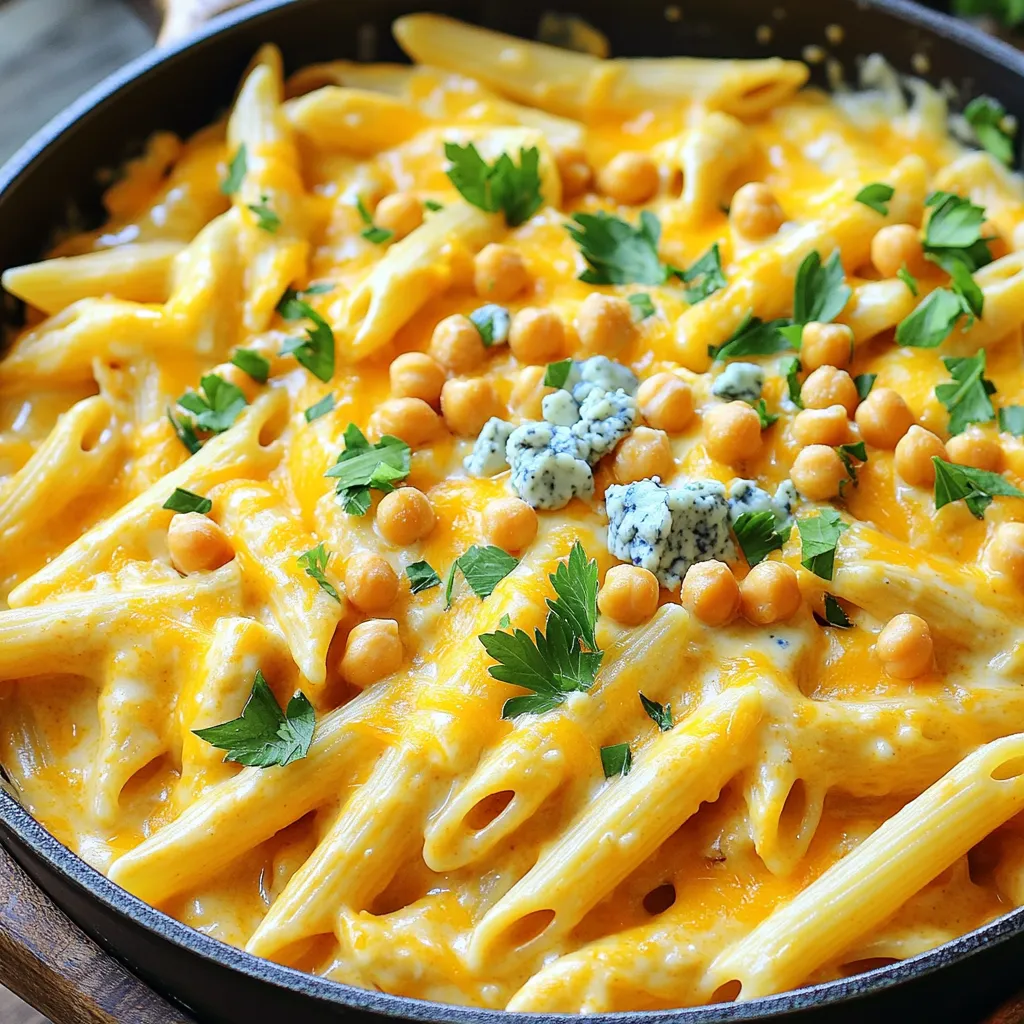 Finally, remove the pot from heat. Let it sit for a few minutes. When ready to serve, garnish with fresh parsley and any optional toppings you like. Enjoy your creamy buffalo chickpea pasta!
