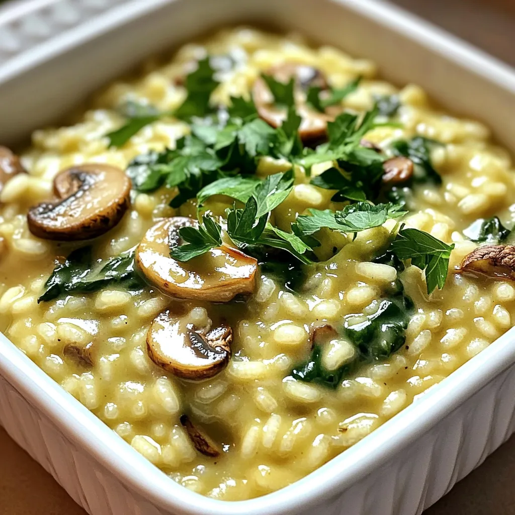 Each ingredient plays a key role. The garlic brings a rich, sweet flavor after roasting. Olive oil adds a nice base and helps with cooking. Arborio rice is special for risotto. It helps create that creamy texture we all love. The vegetable broth gives depth to the dish. The onion and mushrooms add earthy notes and enhance the overall taste. Spinach adds color and nutrition. Finally, Parmesan cheese ties everything together with its creamy, salty goodness.