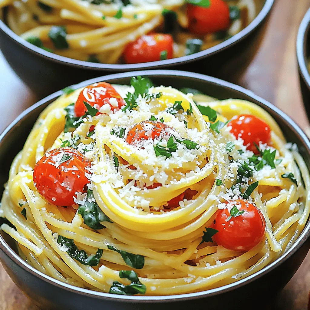 After the pasta cooks, take the pot off the heat. Mix in 1 cup of grated Parmesan cheese. This cheese melts into a creamy sauce. Next, add 2 cups of fresh spinach. Stir it in until the cheese melts and the spinach wilts. Season with salt and black pepper to your taste. If the dish seems dry, add a splash of vegetable broth. Now, it’s ready to serve! Enjoy your delicious one-pot garlic Parmesan spaghetti.