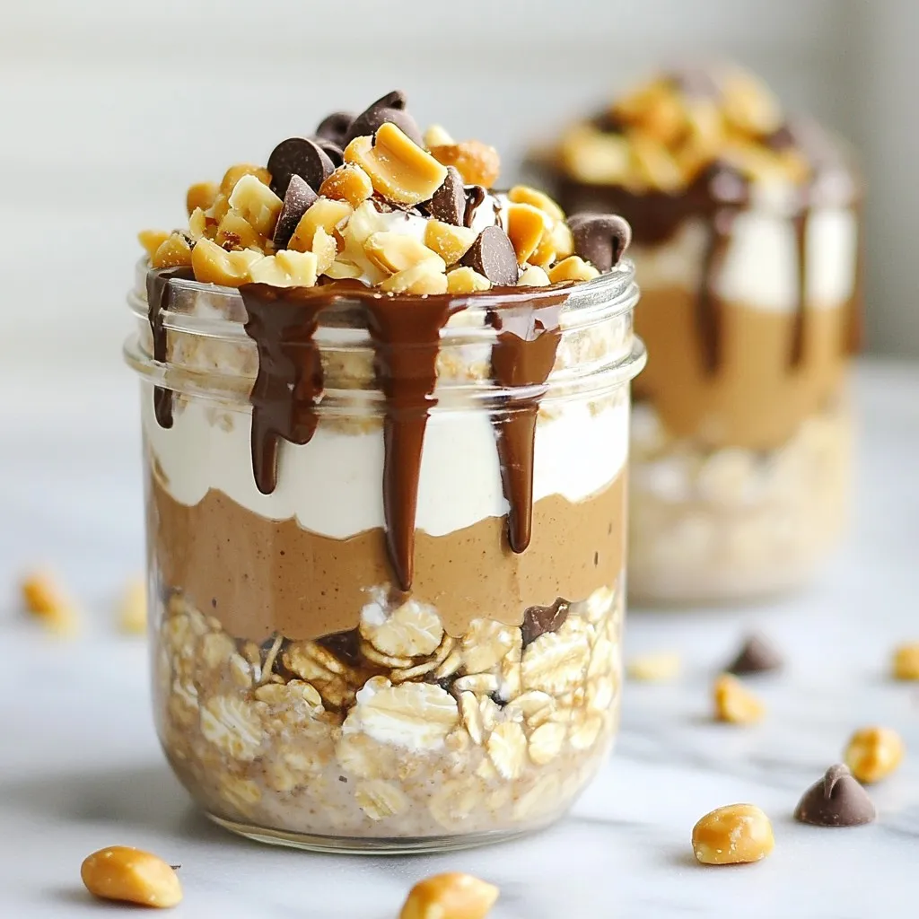 Serve your oats in clear jars. This shows the lovely layers! I like to top mine with mini chocolate chips and chopped peanuts. For extra flair, drizzle more peanut butter on top. You can also sprinkle cocoa powder for a nice touch. Pair these oats with a banana or some berries for a fruity kick. Enjoy with a warm cup of coffee or tea to start your day right!