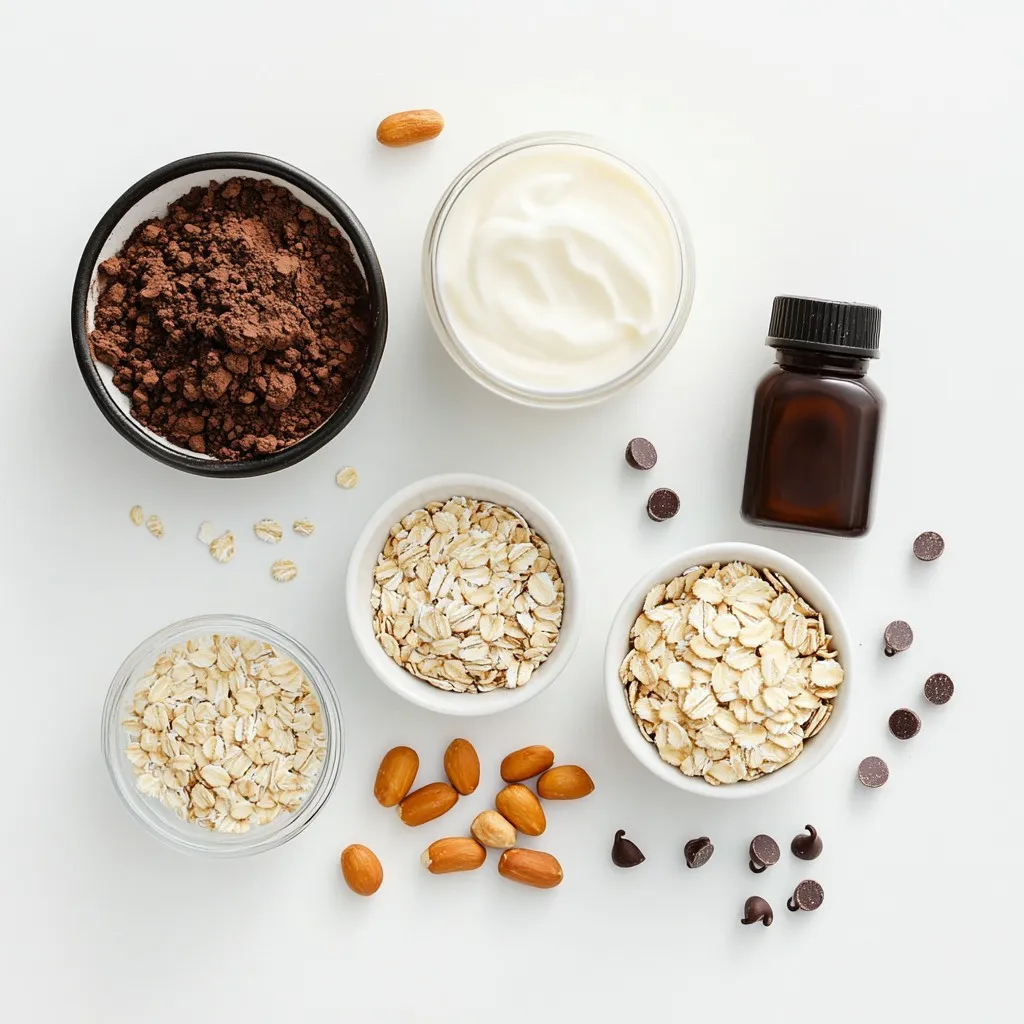 Start by gathering all your ingredients. You need rolled oats, almond milk, Greek yogurt, natural peanut butter, cocoa powder, maple syrup, vanilla extract, salt, mini chocolate chips, and chopped peanuts. In a big bowl, add one cup of rolled oats. Pour in two cups of almond milk. Next, add half a cup of Greek yogurt and a quarter cup of peanut butter. This mix will give your oats a creamy base.