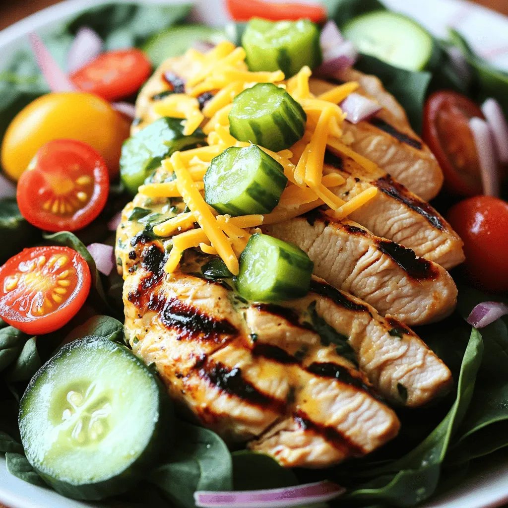 ![Here’s what you need for your Pickle Ranch Chicken and Spinach Salad. Each item adds great taste. - 2 boneless, skinless chicken breasts - 1 cup pickle juice (dill) - 1 tablespoon ranch seasoning mix Marinating the chicken in pickle juice adds a tangy punch. The ranch seasoning gives it a nice, herby flavor. - 4 cups fresh spinach, washed and dried - 1 cup cherry tomatoes, halved - 1/2 cup cucumber, thinly sliced - 1/4 red onion, thinly sliced - 1/2 cup shredded cheddar cheese - 1/4 cup pickles, diced (optional for garnish) These veggies bring color and crunch to your salad. Spinach is packed with nutrients. - 1/4 cup olive oil - 2 tablespoons apple cider vinegar - Salt and pepper to taste This simple dressing ties all the flavors together. It’s easy to make and tastes fresh. For the full recipe, check the earlier sections. Get ready to enjoy a tasty salad! To start, place the chicken breasts in a medium bowl. Pour in the pickle juice, making sure the chicken is fully covered. Marinating enhances the flavor and keeps the chicken juicy. Let the chicken sit in the pickle juice for at least 30 minutes. This time allows the tangy flavor to soak in well. For cooking, you can either grill or use a skillet. Preheat your grill or skillet over medium heat. Remove the chicken from the pickle juice. Season it with ranch seasoning, salt, and pepper. Cook the chicken for 6-7 minutes on each side. You want the internal temperature to reach 165°F (75°C) for safety. After cooking, let the chicken rest for 5 minutes before slicing. This resting time helps keep the juices inside. Now, let’s make the salad. In a large bowl, add the fresh spinach, halved cherry tomatoes, sliced cucumber, and red onion. Make sure to wash and dry the spinach well. This step removes any dirt and keeps the leaves crisp. Combine all the vegetables gently. This ensures even distribution and a colorful mix. For the complete recipe, check out the [Full Recipe]. To make your chicken burst with flavor, marinate it well. Use pickle juice for at least 30 minutes. You can also try lemon juice or yogurt for a tangy twist. Adding garlic powder or smoked paprika can enhance the taste. Fresh herbs like thyme or rosemary work great too. Want to make your salad unique? Add more veggies! Try bell peppers, carrots, or radishes for color and crunch. You can also swap in different proteins. Grilled shrimp or tofu are tasty choices. Rotisserie chicken is a quick fix if you're in a hurry. Feeling adventurous? Change up your dressing! A balsamic vinaigrette gives a sweet touch. If you want creamy, mix Greek yogurt with ranch dressing. Just blend yogurt, a splash of lemon juice, and dill. This makes a lighter but still rich option for your salad. For the full recipe, check out the recipe section above. {{image_2}} You can change the veggies in your salad based on the season. In spring, add asparagus or radishes for a fresh crunch. Summer is great for sweet corn or bell peppers. In fall, think about roasted butternut squash or carrots. Winter calls for hearty greens like kale or Brussels sprouts. Fruits can add a sweet twist to your salad. In spring, toss in sliced strawberries or blueberries. Summer works well with peaches or watermelon. Come fall, add apples or pears to bring in some sweetness. In winter, try pomegranate seeds for a burst of color and flavor. If you're looking for gluten-free options, this salad is easy to adjust. Just check the ranch seasoning mix. Make sure it’s gluten-free. All the other ingredients are naturally gluten-free. For a vegetarian or vegan option, swap the chicken with chickpeas or grilled tofu. You can still use the pickle juice for flavor. Just skip the ranch seasoning or find a plant-based version. This way, you keep the taste without the meat. To make this meal even better, think about side dishes. Serve it with garlic bread or a bowl of soup. A light fruit salad goes well too. You can also transform your salad into a wrap or sandwich. Use a large tortilla or bread. Fill it with salad and sliced chicken. Roll it up for a tasty lunch on the go. To keep your Pickle Ranch Chicken and Spinach Salad fresh, use airtight containers. Glass or plastic containers work well. Make sure to seal them tightly. Store the leftovers in the fridge. They will stay fresh for 3 days. After that, the salad may become soggy. For meal prep, start by cooking extra chicken. You can marinate and grill several chicken breasts at once. Store them in separate containers with some pickle juice. Portion your salad ingredients into ready-to-go bags. This makes it easy to grab and toss together later. It keeps everything fresh and tasty. When reheating, warm the chicken in a skillet or microwave. Heat it until it reaches 165°F (75°C). Avoid reheating the salad. Instead, keep it cold and crisp. Add the chicken on top just before serving. This helps maintain the salad’s fresh taste and texture. You can marinate the chicken for up to 4 hours. This gives it great flavor. If you marinate for too long, the chicken may become too salty or mushy. I recommend sticking to 30 minutes to 4 hours for the best taste and texture. Yes, you can use other greens! Some great alternatives are arugula, kale, or mixed greens. Each green adds a different taste and texture to the salad. Try using a mix for added fun. This salad pairs well with many dishes. You might enjoy serving it with garlic bread or a light soup. For a more filling meal, consider adding rice or quinoa on the side. These options balance the salad nicely. Yes, you can make this salad ahead! To keep it fresh, store the chicken and salad separately. This helps prevent soggy greens. You can dress the salad just before serving for the best taste. This article shared a clear path to making a tasty Pickle Ranch Chicken and Spinach Salad. We covered key ingredients and step-by-step instructions for marinating and cooking the chicken. You learned how to build a colorful salad and customize it to