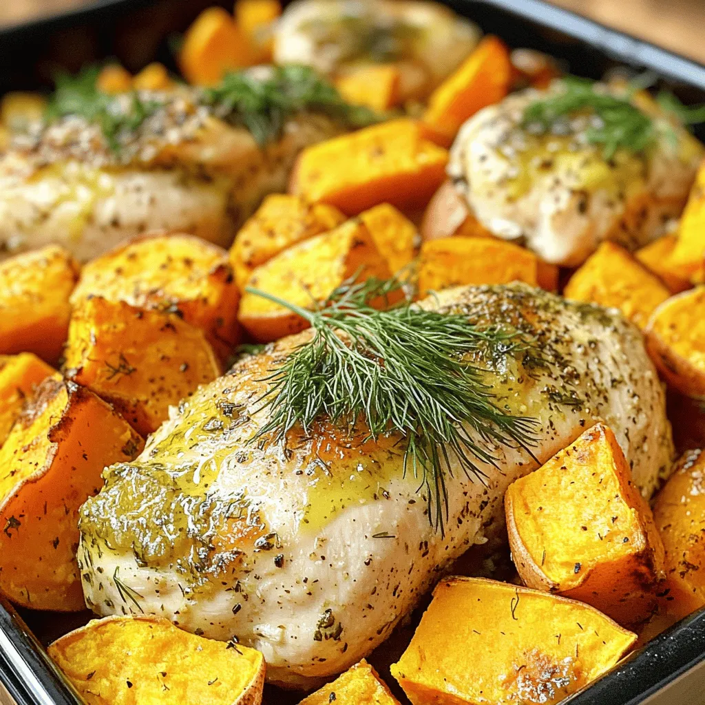 Now it’s time to bake! Spread the sweet potatoes in a single layer on a baking sheet lined with parchment paper. Bake them for 15 minutes. After 15 minutes, take the baking sheet out. Remove the chicken from the pickle juice and discard the liquid. Rub one tablespoon of ranch seasoning mix over each chicken breast. Place the seasoned chicken on top of the sweet potatoes. Return the baking sheet to the oven. Bake for another 25 to 30 minutes. The chicken should reach an internal temperature of 165°F (75°C), and the sweet potatoes should be tender. Once done, let the dish rest for five minutes before serving. You can garnish with fresh dill or parsley if you like. Enjoy your meal!