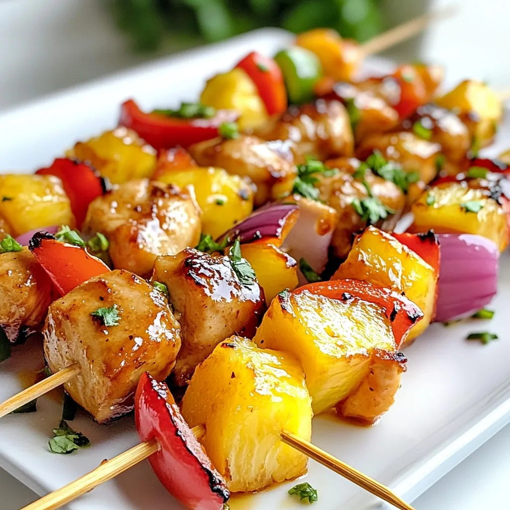Delicious grilled skewers featuring marinated chicken, fresh pineapple, and colorful vegetables.