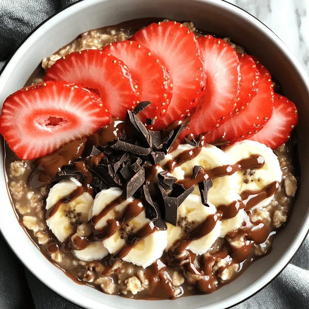 Top your oatmeal with sliced strawberries, which add a fresh look. You can also sprinkle dark chocolate shavings for a fancy touch. If you want, add a spoonful of nuts or chia seeds for texture.