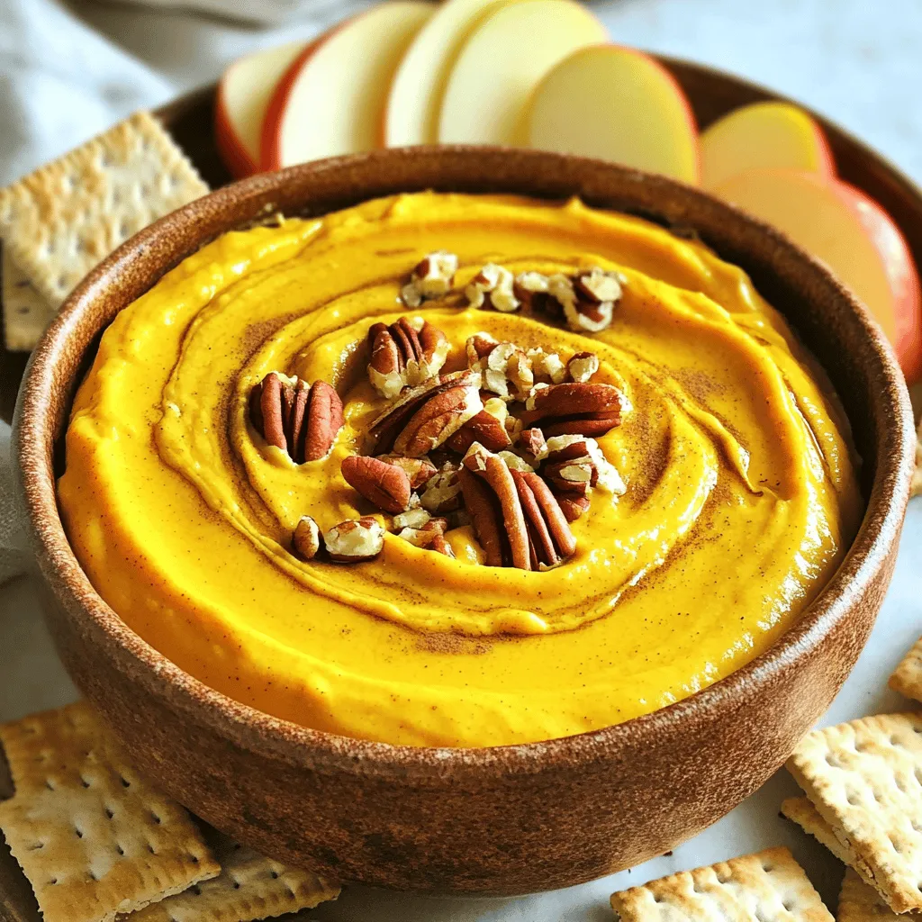 Serve the dip in a fun bowl. A pumpkin-shaped bowl is perfect for fall! Top it with chopped pecans for a crunchy finish. Arrange your dippers around the bowl. Use colorful apple slices, graham crackers, or pretzels. This makes your dessert look inviting and festive.