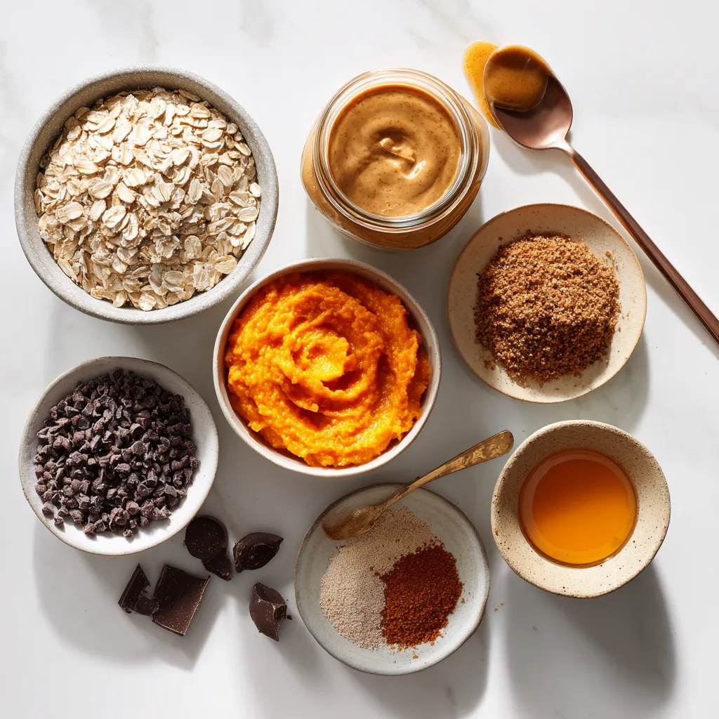 Start by gathering all your ingredients. You will need rolled oats, almond butter, canned pumpkin, honey or maple syrup, pumpkin spice mix, salt, ground flaxseed, and optional chocolate chips or nuts. Take a large mixing bowl. In this bowl, add: