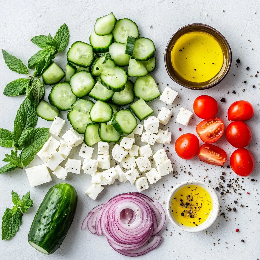 To make the Cucumber Mint Feta Salad, start with fresh ingredients. Cucumbers are crisp and hydrating. I recommend using large cucumbers for the best texture. Cherry tomatoes add a sweet burst of flavor. The feta cheese brings creaminess to the mix. Red onion adds a little bite. Fresh mint leaves give a refreshing taste that makes this dish stand out.