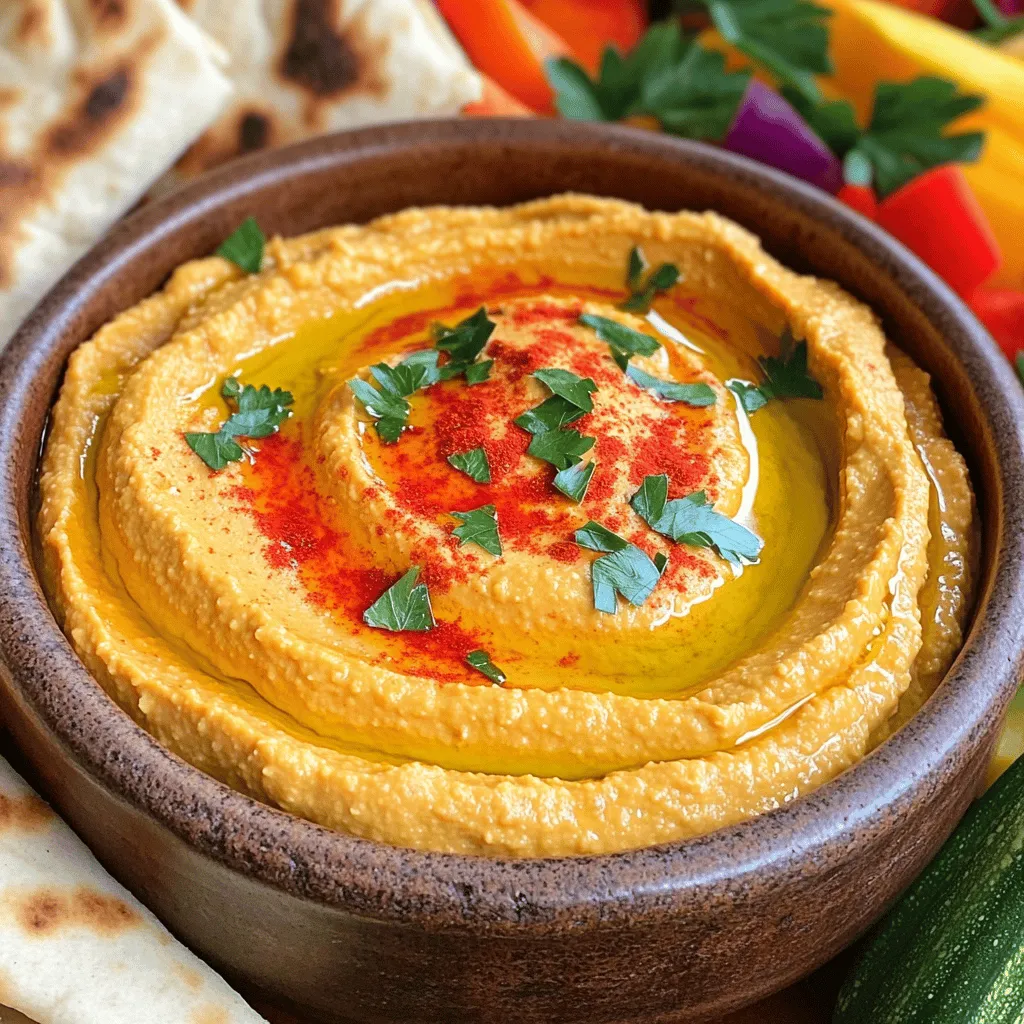 ![To make this hummus, you need some simple, fresh ingredients. Here’s what to gather: - 1 can (15 oz) chickpeas, drained and rinsed - 1 large roasted red pepper, peeled and seeded - 2 tablespoons tahini - 2 tablespoons lemon juice - 2 cloves garlic, minced - 2 tablespoons olive oil (plus more for drizzling) - ½ teaspoon ground cumin - Salt and pepper to taste These ingredients work together to create a creamy and flavorful dip. The roasted red pepper adds a sweet, smoky taste that pairs well with chickpeas. Tahini gives it a rich texture, while lemon juice brightens the flavor. To make your hummus look even more inviting, consider these tasty garnishes: - Paprika, for a pop of color - Fresh parsley, chopped, for a fresh touch - A drizzle of olive oil, for added richness These extras can elevate your dish and make it more appealing to the eye. Roasted red pepper hummus is versatile and pairs well with many foods. Here are some great serving ideas: - Warm pita bread - Fresh cut veggies like carrots, cucumbers, and bell peppers - As a spread on sandwiches or wraps These options not only enhance the flavors but also make for a healthy snack or meal. For the full recipe and step-by-step guide, check out the [Full Recipe]. To start, you need to roast the red pepper. If you use fresh peppers, place them under a broiler or on a grill. Roast them until they are charred on all sides. This should take about 10 minutes. After roasting, put the peppers in a bowl and cover it with plastic wrap. This steams them and makes peeling easier. After 10 minutes, peel off the skin and remove the seeds. Set the roasted red pepper aside for later. Next, you will blend the ingredients. In a food processor, add the drained chickpeas, the roasted red pepper, tahini, lemon juice, minced garlic, olive oil, and ground cumin. Make sure you have everything ready before you start. This blend gives your hummus its rich flavor. Now, it’s time to process the mix. Pulse the ingredients until they become smooth and creamy. If your hummus looks too thick, add a bit of water or more olive oil. Do this one tablespoon at a time. Keep blending until you reach the perfect consistency. Finally, taste the hummus and add salt and pepper to your liking. Blend briefly to mix it in. For the full recipe, check the Full Recipe section. Enjoy your homemade flavor! You can change the taste of your hummus easily. Add spices like smoked paprika for a smoky kick. Try fresh herbs like basil or cilantro for a green twist. For heat, add a pinch of cayenne or red pepper flakes. You can also mix in roasted garlic for a rich flavor. Blend in sun-dried tomatoes for a tangy bite. Experimenting lets you find your perfect blend. To keep your hummus fresh, store it in an airtight container. Place a thin layer of olive oil on top. This helps prevent it from drying out. Keep it in the fridge for up to a week. If you want to store it longer, freeze it! Portion it into small containers to use later. Just thaw in the fridge overnight before serving. Roasted red pepper hummus is great for any event. Serve it as a dip with pita chips or fresh veggies. It’s perfect for game day or a picnic. Spread it on sandwiches or wraps for a tasty lunch. For dinner parties, serve it in a bowl with a drizzle of olive oil. Add fresh herbs and paprika on top for a nice touch. You can find the full recipe in the article for more ideas. {{image_2}} To add heat to your hummus, mix in some spices. Try adding 1 to 2 teaspoons of cayenne pepper or a dash of hot sauce. Blend it in with the other ingredients. This will give your hummus a nice kick. You can adjust the heat to suit your taste. This spicy twist pairs well with pita chips or crunchy veggies. You can also infuse your hummus with fresh herbs. Basil, cilantro, or dill make great choices. Chop about ¼ cup of your chosen herb and blend it into the hummus. This adds a fresh flavor and makes the dish even more vibrant. It’s a fun way to change up the taste without much effort. While chickpeas are classic, you can try other beans. Black beans or white beans work well, too. Swap out the chickpeas for 1 can of your chosen beans. This gives a new flavor and texture. Each bean type will change the taste, so feel free to experiment. You might find a new favorite variation! For the full recipe, you can check the main article. Store your roasted red pepper hummus in an airtight container. Make sure the lid is tight. This keeps the hummus fresh and tasty. You can put a thin layer of olive oil on top. This helps seal in moisture and flavor. You can freeze hummus for later use. Use a freezer-safe container or bag. Leave some space for the hummus to expand as it freezes. When you’re ready to eat, thaw it in the fridge overnight. Stir it well before serving again. Refrigerated hummus lasts about 4 to 7 days. Check for changes in color or smell. If it looks dry or has mold, it’s time to toss it. Fresh hummus should smell light and nutty. For the best taste, eat it within a week. For the Full Recipe, refer back to the main article. To make roasted red pepper hummus from scratch, gather your ingredients. Use chickpeas, roasted red pepper, tahini, lemon juice, garlic, olive oil, and cumin. Blend the chickpeas and roasted red pepper in a food processor. Add tahini, lemon juice, garlic, and olive oil. Pulse until smooth. If it's too thick, add water or more olive oil. Season with salt and pepper to taste. This process takes about 20 minutes. For a detailed guide, check the Full Recipe. Yes, you can use jarred roasted red peppers. They save time and add great flavor. Just make sure to drain them well before adding to your hummus. This way, your hummus won't be too watery. It’ll still taste fresh and delicious. Hummus is a healthy choice packed with nutrients. It contains protein from chickpeas, which helps build muscle. Tahini adds healthy fats, while olive oil boosts heart health. Hummus also contains fiber, aiding digestion. Plus, 