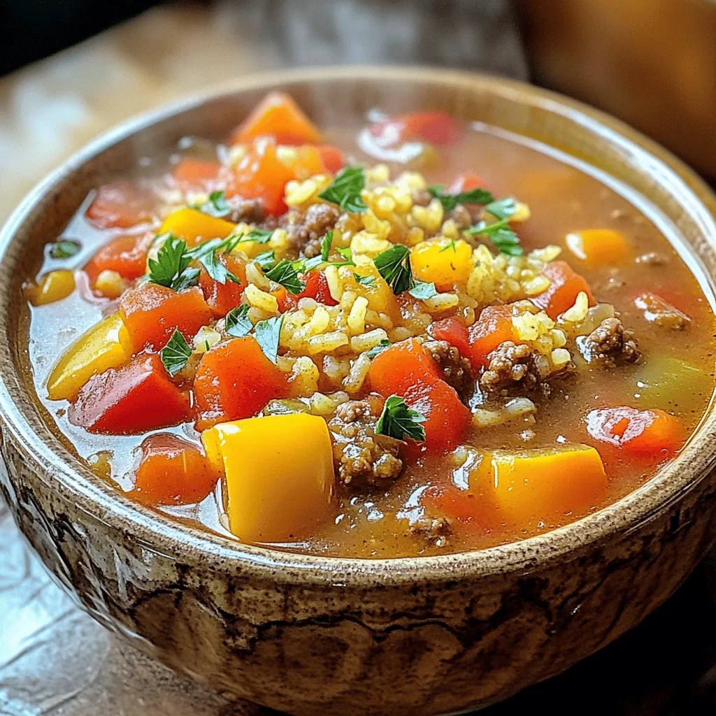 Bell peppers are the star of this soup. They add sweetness and color. I like to mix red, yellow, and green for a vibrant look. Ground beef or turkey gives the soup its hearty base. Turkey makes it lighter but both options work well. Rice adds texture and makes the soup filling.