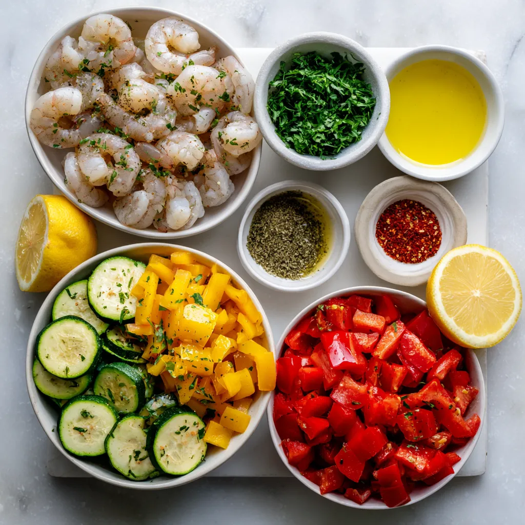 1. In a large bowl, combine the shrimp, cherry tomatoes, bell pepper, and zucchini.