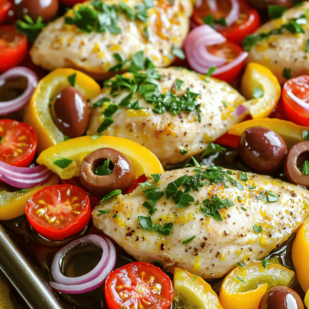 While the chicken marinates, prepare the vegetables. Slice 1 red bell pepper and 1 yellow bell pepper. Cut 1 red onion into wedges and add 1 cup of cherry tomatoes and 1/2 cup of Kalamata olives to the sheet pan. Drizzle the remaining marinade over the vegetables and toss them gently to coat. This adds flavor to every bite.