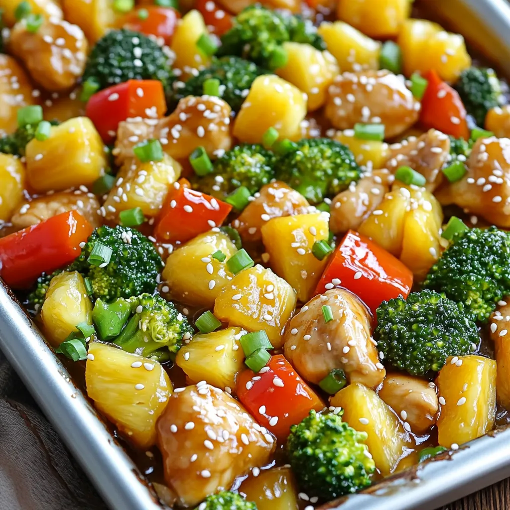 1. Bake first 20 minutes and add pineapple: Spread the chicken and vegetable mix evenly on a large sheet pan. Bake in the preheated oven for 20 minutes. After 20 minutes, add the pineapple chunks to the pan and stir everything gently before returning it to the oven.