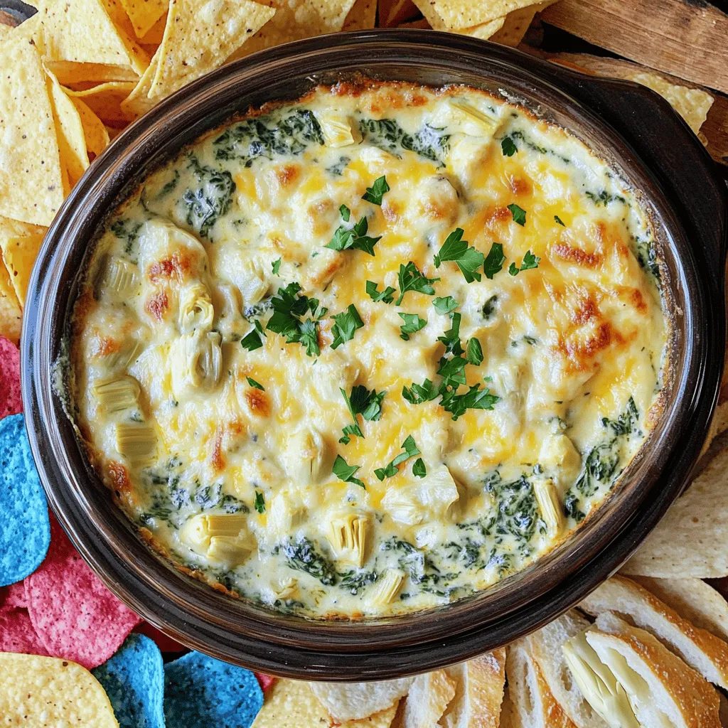 For dippers, you have many choices. Tortilla chips are a classic option. Sliced baguette works well too. Fresh vegetable sticks like carrots or celery add a nice crunch. Feel free to mix and match your dippers to please everyone. Enjoy your creamy spinach artichoke dip!