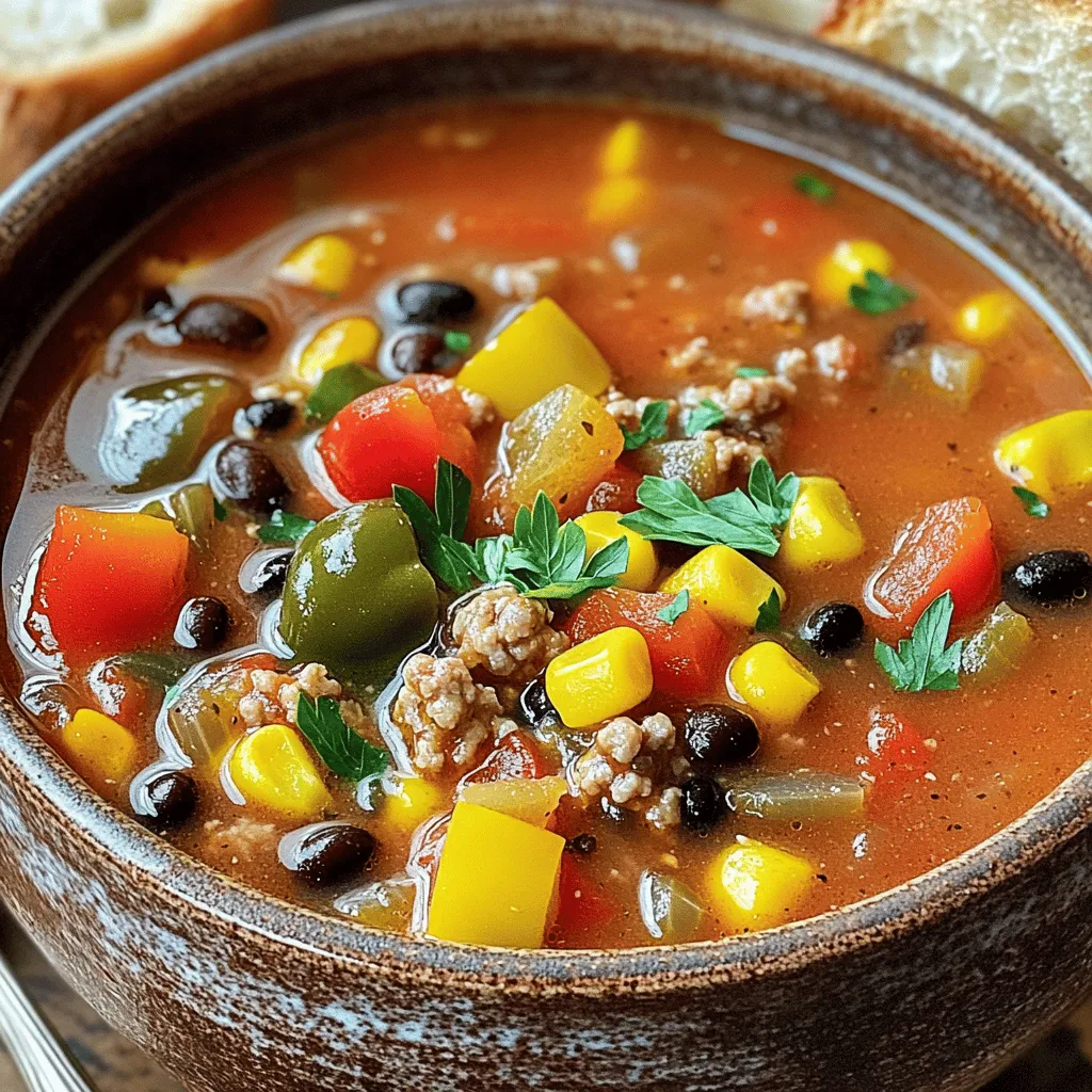 In this tasty soup, ground turkey or beef provides a rich base. I love using three colors of bell peppers for a bright look and more flavor. Diced tomatoes add a juicy texture, while black beans bring protein and heartiness to the dish.