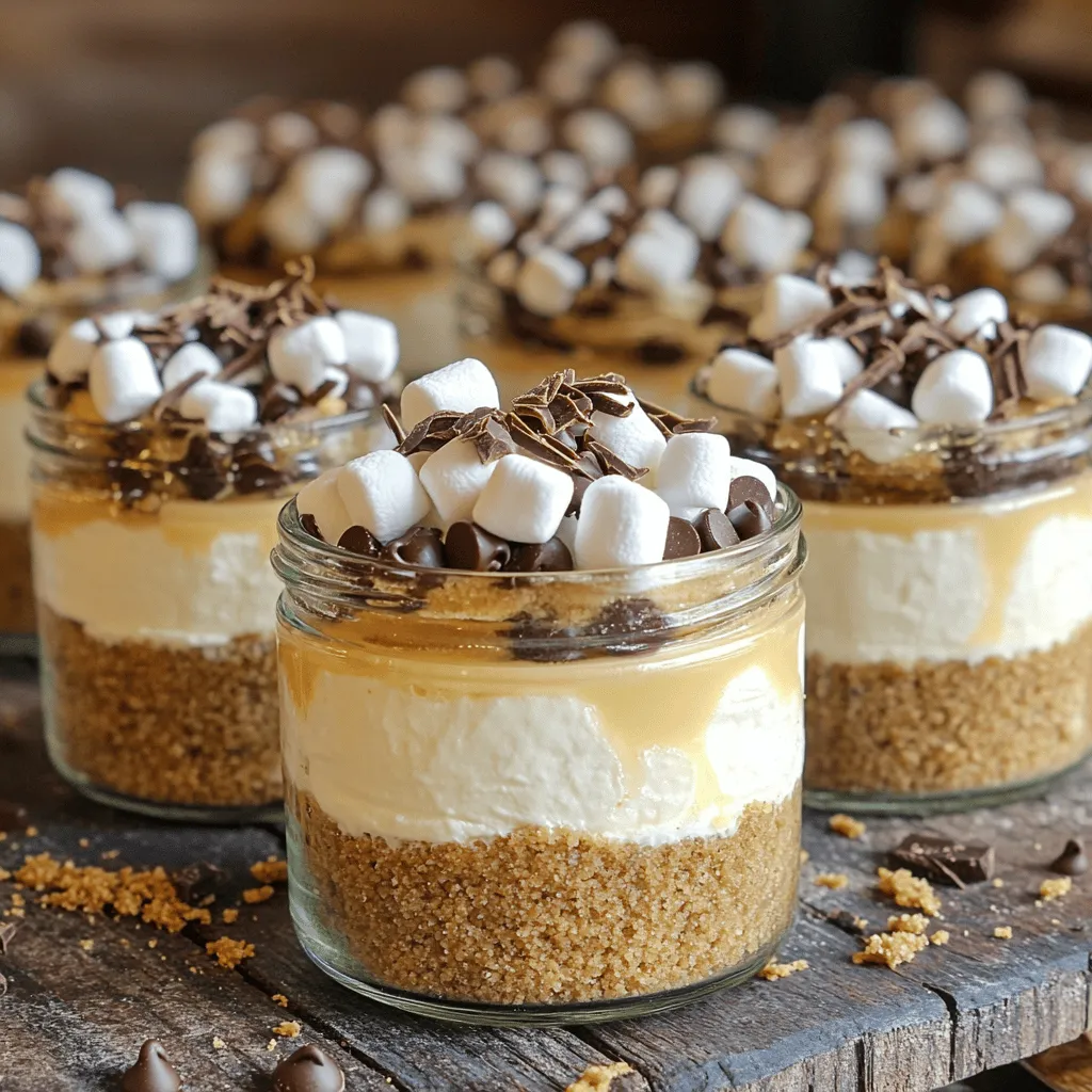 It’s time to layer the jars. Spoon a layer of the cheesecake filling over the crust in each jar, filling them halfway. Then, sprinkle a layer of mini marshmallows and chocolate chips on top. This gives it that classic s’mores taste. Add another layer of cheesecake filling next. Finish with the remaining graham cracker crust on top.