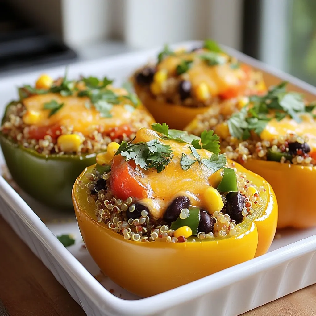 A delicious and healthy dish featuring bell peppers stuffed with quinoa, black beans, corn, and spices.