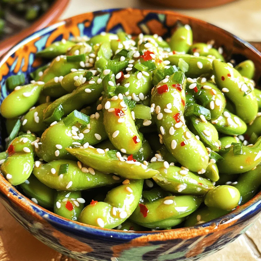 ![- 2 cups edamame (in pods), fresh or frozen - 4 cloves garlic, minced - 3 tablespoons olive oil - 2 tablespoons soy sauce - 1 tablespoon sesame oil - 1-2 teaspoons red pepper flakes (adjust for spice level) - 1 tablespoon sesame seeds (optional for garnish) - Chopped green onions for garnish - Skillet - Cooking pot or steamer - Measuring spoons When I make Spicy Garlic Edamame, I always start with fresh or frozen edamame. Edamame is packed with protein and tastes great. I love using garlic for its rich flavor. Olive oil adds a nice touch and helps everything cook evenly. Soy sauce gives a savory kick that ties it all together. For an extra layer of flavor, I sometimes use sesame oil. It adds a nutty taste that makes the dish shine. If you want some heat, red pepper flakes are perfect. Just add more or less based on your taste. For garnishes, I sprinkle sesame seeds and chopped green onions. They make the dish look nice and add crunch. To prepare this dish, you'll need a skillet to sauté and a pot or steamer to cook the edamame. Measuring spoons help keep everything precise. These tools make cooking easier and more fun. For the full recipe, check out the [Full Recipe]. To start, you must choose between fresh or frozen edamame. If you use frozen, cook them as the package shows. If you pick fresh, steam or boil them for about 5-7 minutes. The pods should turn bright green and tender. Once cooked, be sure to drain them well. This step is important. Draining removes excess water and keeps your dish from becoming soggy. Set the drained edamame aside. Next, heat a large skillet over medium heat. Pour in the olive oil and let it warm up. After a minute, add the minced garlic. Cook the garlic for 1-2 minutes. You want it to be fragrant but not browned. If it browns, it will taste bitter. This garlic will add a rich flavor to your dish. Now, it’s time to spice things up! Sprinkle in the red pepper flakes and stir for about 30 seconds. This will release their heat. After that, add the cooked edamame into the skillet. Toss them well to coat with the garlic and oil. Next, drizzle soy sauce and sesame oil over the edamame. Toss everything together for 2-3 minutes. This allows all the flavors to mix. If you need to, season with salt to taste. Finally, serve your spicy garlic edamame in a bowl. Garnish with sesame seeds and chopped green onions. Enjoy this tasty snack or appetizer. For the full recipe, check the complete instructions above. To make your spicy garlic edamame just right, adjust the red pepper flakes. Start with one teaspoon for a bit of heat. If you like it spicy, add more. You can also use fresh chili peppers or chili oil. These can give a fresh taste and heat. If you need a milder flavor, skip the red pepper flakes. Instead, try adding a bit of honey or sugar. This can balance the garlic and soy sauce. You can also use mild chili powder for less heat. To store leftovers, let the edamame cool first. Place it in a sealed container. You can keep it in the fridge for up to three days. When you want to eat it again, reheat it in a skillet. Heat on medium for about five minutes. Stir it well so it warms evenly. You can also use a microwave. Heat for about 30 seconds, checking often, so it doesn’t overcook. For a great look, serve your edamame in a bright bowl. A colorful dish makes the food pop. You can also sprinkle extra sesame seeds and green onions on top. This adds more color and texture. Consider serving edamame with chopsticks. It makes for a fun eating experience. You can pair it with a small dish of soy sauce for dipping. This adds a nice touch, making it feel special. The [Full Recipe] will guide you in making this tasty snack. {{image_2}} You can make spicy garlic edamame even better. One way is to add citrus zest or juice. A squeeze of lemon or lime gives a fresh taste. It brightens the dish and balances the spice. You can also mix in other vegetables. Try bell peppers or carrots for added crunch and color. These small changes make the dish more exciting! If you need gluten-free options, swap soy sauce for tamari. Tamari has the same great flavor without gluten. For vegan adjustments, ensure your ingredients are plant-based. Most of the ingredients in this recipe are already vegan. This way, everyone can enjoy this tasty snack! Grilling edamame is a fun way to add smoky flavor. Simply toss the pods on the grill for a few minutes. It gives a unique twist to the dish. If you want a lighter option, avoid oil. Instead, steam or boil the edamame, then toss them in the garlic mix. This keeps them healthy yet delicious. Edamame is a powerhouse of nutrition. First, it has a high protein content. One cup of edamame gives you about 17 grams of protein. This makes it a great snack for those who want to build muscle or stay full longer. Next, edamame is rich in vitamins and minerals. It contains vitamin K, which helps with blood clotting. It also has folate, which is important for cell function. You’ll find potassium, magnesium, and iron in edamame too. These nutrients support heart health and keep your bones strong. Each serving of spicy garlic edamame has around 150 calories. This makes it a guilt-free snack. If you modify the recipe, like using less oil, the calorie count goes down. For example, you can cut the olive oil to two tablespoons. This keeps it tasty while reducing calories. Store-bought edamame snacks may seem easy, but they often lack freshness. Homemade is better for nutrition. You control the ingredients and avoid preservatives. Plus, homemade spicy garlic edamame is often cheaper. You can buy a bag of frozen edamame for less than a dollar. In contrast, store-bought snacks can cost three times as much. Making your own is not only tasty but also budget-friendly. For the full recipe, check the Spicy Garlic Edamame section at the beginning. You can cook edamame in several ways. If you use frozen edamame, follow the package instructions. For fresh edamame, steam or boil 