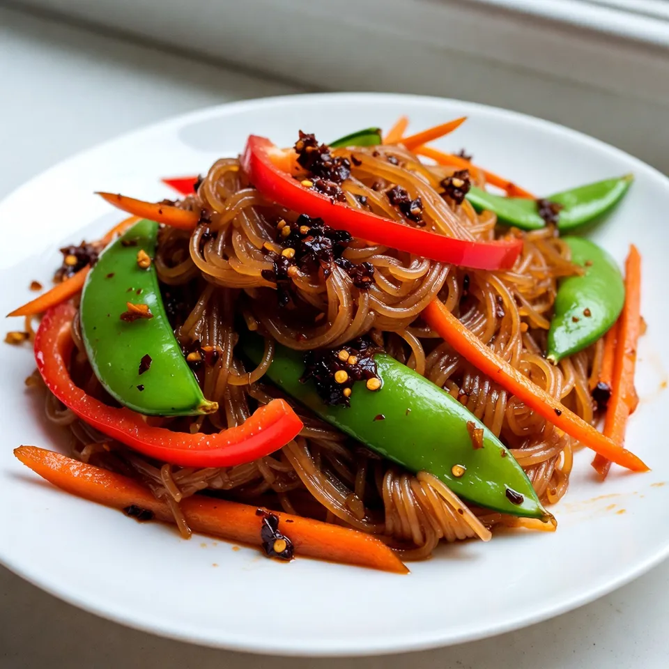 Now, it’s time to add the fun part—vegetables! Put the sliced red bell pepper, snap peas, and julienned carrot into the skillet. Stir-fry these for about 3-4 minutes. You want them to be tender-crisp, not soft. This keeps the dish fresh and colorful. In a small bowl, mix the soy sauce, chili sauce, rice vinegar, and honey or agave syrup. Pour this sauce over the cooked vegetables. Stir well to coat everything. Add the cooked rice noodles next. Toss them in the skillet, mixing well with the sauce. Cook for an additional 2-3 minutes. Finally, fold in the chopped green onions. Taste and add more soy or chili sauce if you like. Enjoy your vibrant Spicy Garlic Noodle Stir Fry!