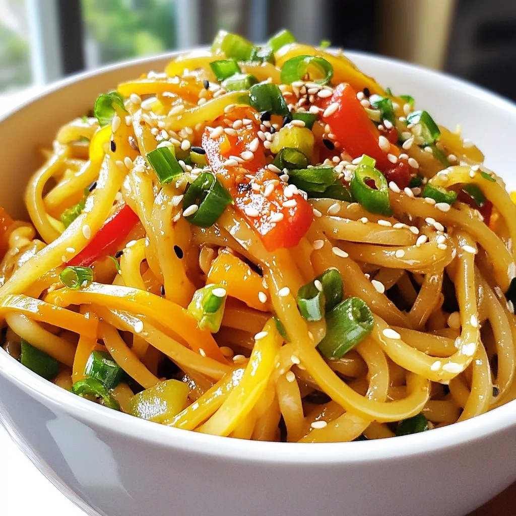 A delicious and spicy noodle dish with garlic and bell peppers.