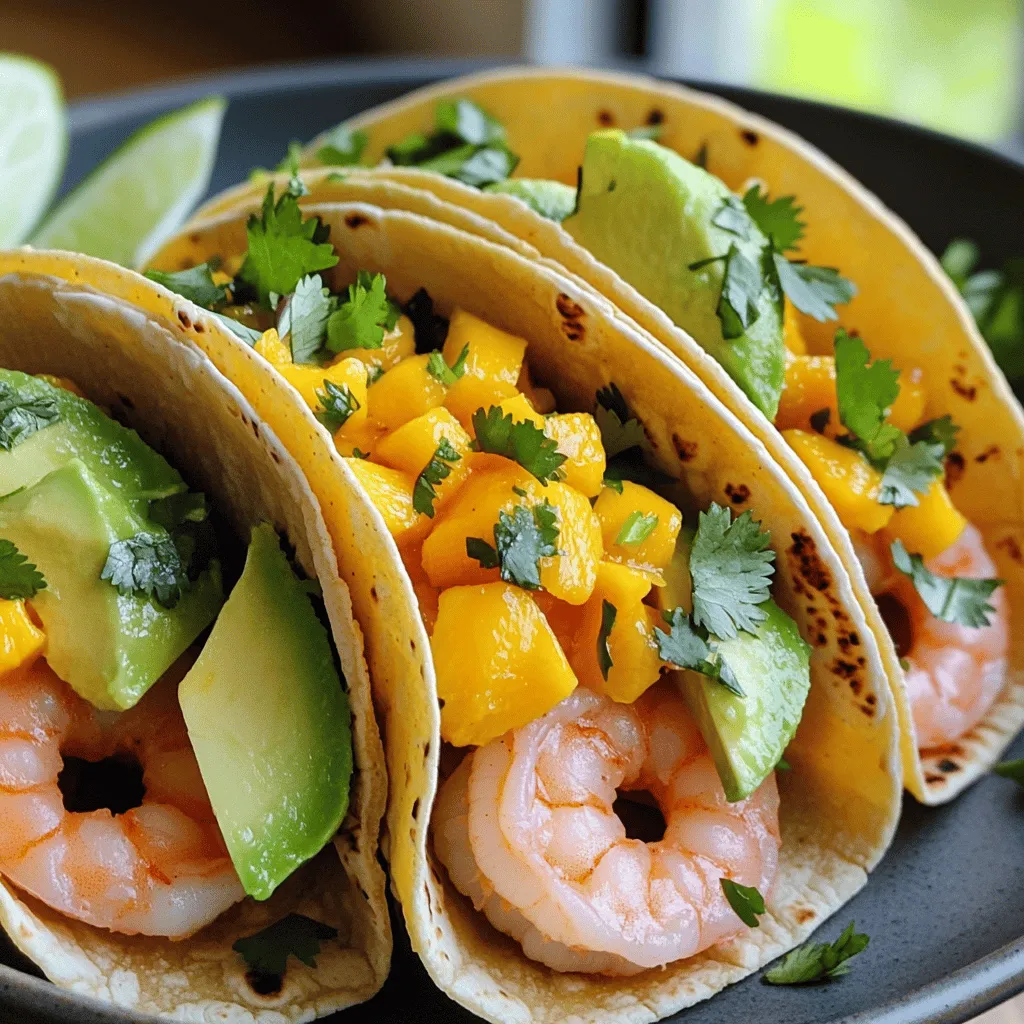 To assemble the tacos, take a warm tortilla and place a few shrimp on top. Add a spoonful of mango salsa and some avocado slices. Garnish with fresh cilantro. Serve your tacos with lime wedges on the side for an extra burst of flavor. Enjoy this fresh and flavorful delight!