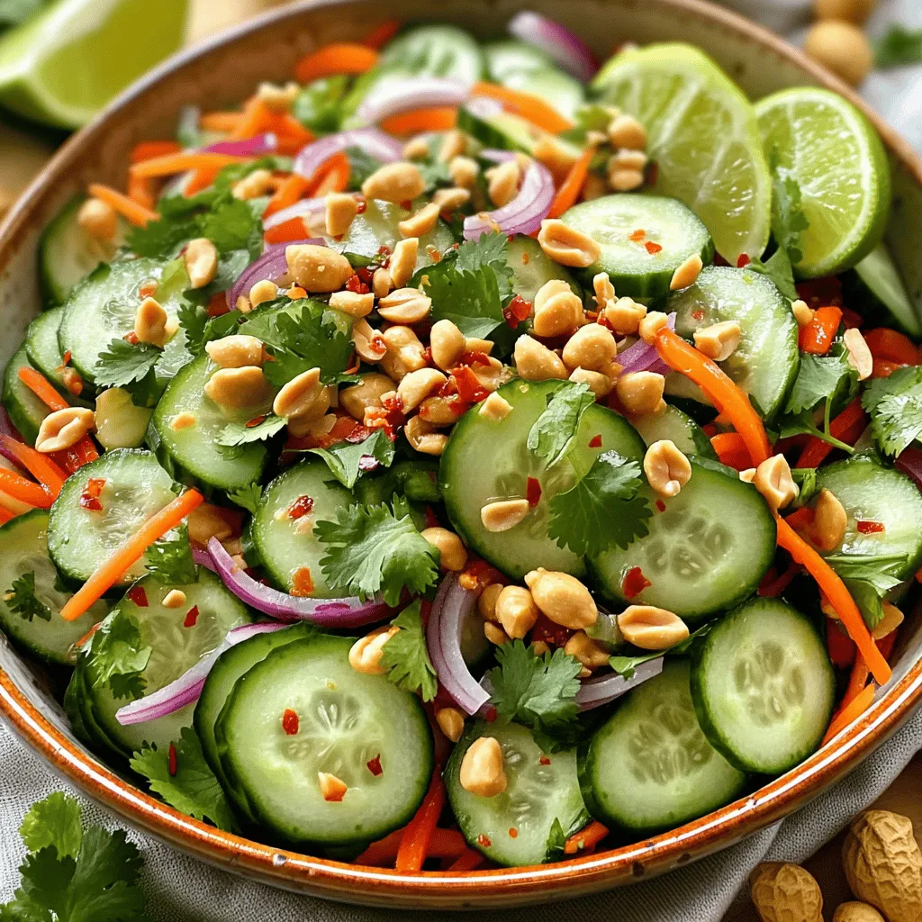 ![- 2 cups cucumbers, thinly sliced - 1 carrot, julienned - 1 red bell pepper, thinly sliced - 1/4 cup red onion, finely sliced - 1/4 cup fresh cilantro, chopped - 1/4 cup roasted peanuts, roughly chopped - 2 tablespoons lime juice - 1 tablespoon fish sauce (or soy sauce for a vegetarian option) - 1 tablespoon chili paste - 1 teaspoon sugar - Salt to taste To make the Spicy Thai Cucumber Salad, gather all these ingredients. Fresh cucumbers are the star here. They bring crunch and a cool taste. The carrot and red bell pepper add color and more crunch. Red onion gives a nice bite, while cilantro adds freshness. The dressing ties it all together. Lime juice brings a zesty tang. Fish sauce adds umami flavor, but soy sauce works too. Chili paste gives heat, so adjust it based on your taste. Sugar balances the flavors, and a pinch of salt enhances everything. Each serving of this salad is low in calories. It has about 120 calories, with 7 grams of fat and 12 grams of carbs. You get 3 grams of protein too. This salad is a great source of vitamins A and C. It also has potassium and magnesium, making it a healthy choice. For the full recipe, you can check out the complete instructions and tips. Enjoy this light and refreshing salad! To start, slice your cucumbers thin. I like to use a sharp knife for this. Thin slices make the salad crunchy and fresh. For the carrot, julienne it carefully. This means cutting it into long, thin strips. This helps it mix well with the cucumber. Blend the flavors before serving. This is crucial for a tasty salad. Letting it sit allows the veggies to soak up the dressing. You will love how the flavors come together. Whisk the dressing in a small bowl. Add lime juice, fish sauce or soy sauce, chili paste, sugar, and a pinch of salt. Make sure to mix well until it is smooth. If you want more heat, add extra chili paste. Adjust it to your spice level. Now, it’s time to mix the salad. Toss the cucumber, carrot, red bell pepper, and onion gently. This keeps the vegetables from getting mushy. Once they are mixed, add the cilantro and peanuts. Toss it again gently. Let the salad rest for 10 to 15 minutes. This resting time helps the flavors meld together. Taste it before serving. You can adjust with more salt or lime juice if needed. Enjoy this refreshing dish! For the full recipe, check here: [Full Recipe]. To make a great spicy Thai cucumber salad, start with fresh ingredients. Here are some tips: - Cucumbers: Choose firm, shiny cucumbers. Look for ones with no soft spots or wrinkles. English cucumbers work well for their thin skin and fewer seeds. - Carrots: Select bright orange carrots. They should feel crisp and have a smooth surface. - Bell Peppers: Pick bell peppers that are heavy for their size. They should have a vibrant color and firm skin. For easy preparation, use these kitchen tools: - Sharp Knife: A good knife makes slicing easier and safer. - Cutting Board: A sturdy cutting board helps keep your workspace tidy. - Mixing Bowl: Use a large bowl to mix the salad without spilling. You can elevate the flavor of your salad. Consider adding these herbs and spices: - Mint: Fresh mint adds a cool touch. - Thai Basil: This herb brings a unique flavor twist. - Chili Flakes: If you want more heat, sprinkle some chili flakes on top. For protein, try these options: - Grilled Chicken: Sliced grilled chicken adds heartiness. - Shrimp: Cooked shrimp adds a nice seafood flavor. These simple additions can make your salad even more delicious. For the full recipe, check out the [Full Recipe]. {{image_2}} For a vegetarian or vegan twist, you can easily swap out the fish sauce. Use soy sauce or tamari to keep it flavorful. Both options provide a rich umami taste. You can also add tofu. Firm tofu works best. Simply cube it and toss it into the salad for extra protein. This makes the dish heartier without losing its freshness. You can change up the veggies based on what’s in season. In summer, add some ripe tomatoes or radishes for a crunch. During fall, thinly sliced apples can add a sweet touch. You can even mix in fruits like mango. The sweetness of mango pairs well with the spicy dressing. This adds a fun twist to your salad. If you like heat, adjust the chili paste in the recipe. Start with a small amount and taste as you go. You can also try different types of chili sauces. Sriracha or sambal oelek can add a unique flavor. For less heat, use sweet chili sauce instead. This way, you can make the salad just right for your taste buds. Feel free to explore these variations to keep your salad exciting. Each change can bring a new flavor and experience to your table. For the full recipe, check out the details provided earlier. To keep your Spicy Thai Cucumber Salad fresh, use an airtight container. Glass or plastic containers work well. This salad stays good in the fridge for about 2 days. After that, the veggies may get too soft. You don’t need to heat this salad. Serve it cold for the best taste. If you make it ahead of time, stir it gently before serving. This will help mix the flavors again. When making portions, store the dressing separately. This way, the salad stays crisp and tasty! For the full recipe, check the recipe card. You can use soy sauce or tamari instead of fish sauce. Both give a salty taste. Tamari is a great choice for gluten-free diets. These options keep the flavor rich while being vegetarian-friendly. Yes, you can make this salad a few hours before serving. Just add the dressing right before you eat. This keeps the veggies crunchy and fresh. If you store it too long, the salad may become soggy. The spice level depends on how much chili paste you use. If you like it mild, start with a small amount. You can always add more later. This way, you control the heat. This salad pairs well with grilled meats or fish. It also complements rice dishes nicely. Try serving it with spring rolls for a fun meal. The salad adds a fresh crunch to any plate. You can buy roa