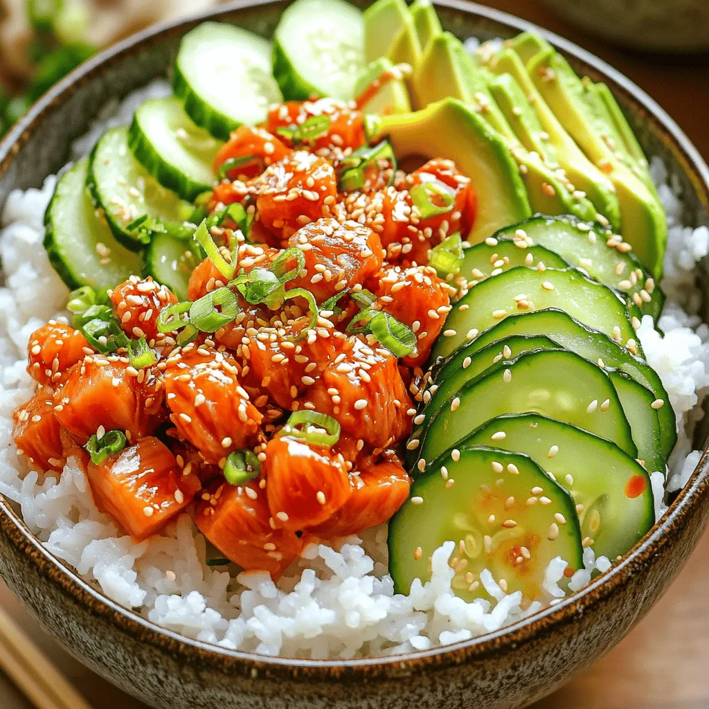 Once the rice has rested, it’s time to assemble your bowls. Start by fluffing the rice with a fork. If you like, add a pinch of salt for extra flavor. Divide the rice into your serving bowls. Next, top each bowl with the spicy tuna mixture. Add sliced avocado, thin cucumber slices, and sprinkle green onions on top. Finally, add a sprinkle of sesame seeds for crunch. Don’t forget to garnish with nori strips. This extra touch adds flavor and a fun texture. For an optional touch, serve with soy sauce on the side. Enjoy your delicious and healthy spicy tuna sushi bowls!