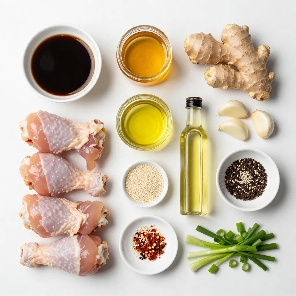 Start by gathering your ingredients. You need eight chicken drumsticks, soy sauce, honey, olive oil, garlic, ginger, rice vinegar, sesame oil, black pepper, and optional crushed red pepper flakes.
