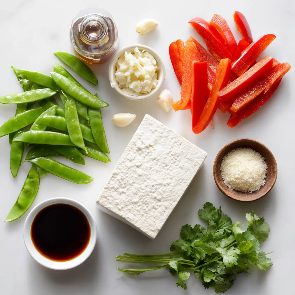 Gather these items before you start cooking. You’ll need firm tofu, fresh veggies, and tasty sauces. I love using vibrant bell peppers and crunchy snap peas. They add color and crunch to the dish. The sweet chili sauce gives the stir fry its signature flavor. Don’t forget the garlic and ginger; they add a nice kick.