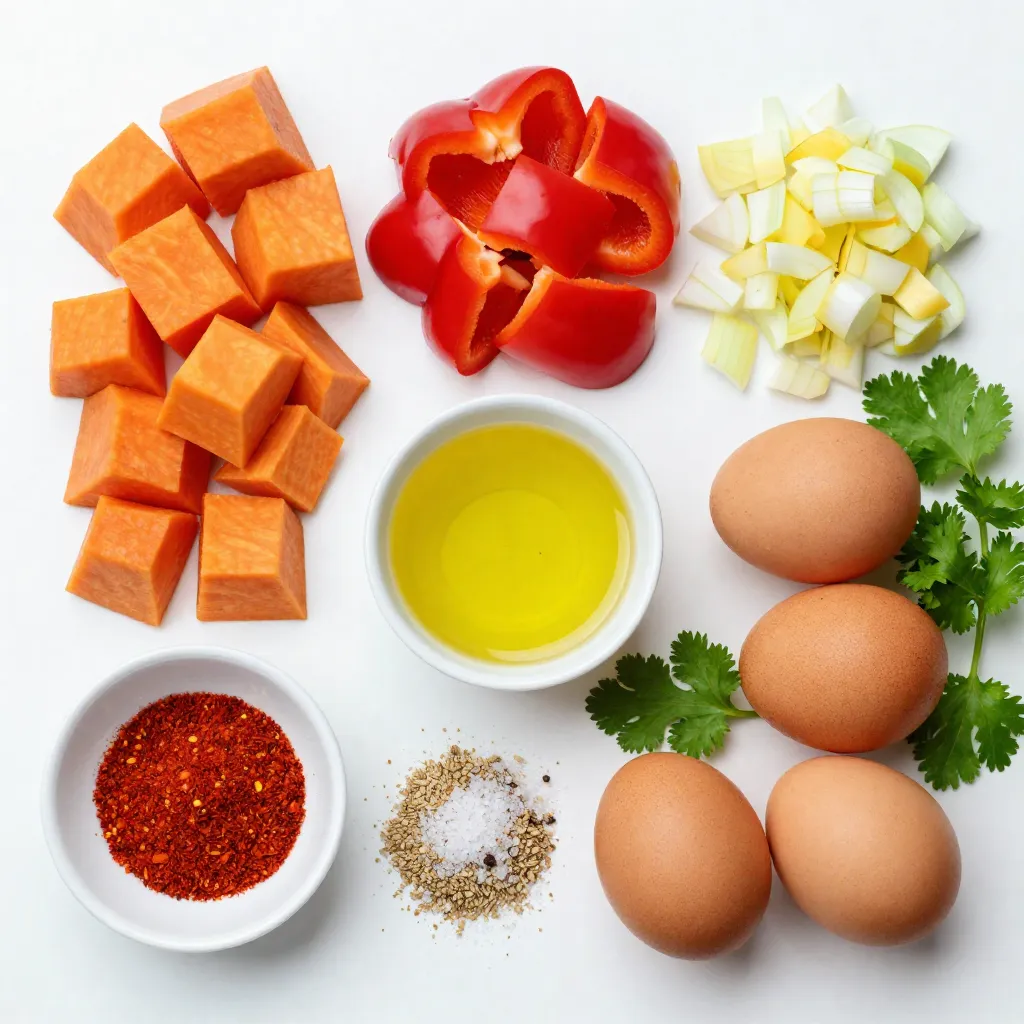 A hearty and colorful hash made with sweet potatoes, bell peppers, and eggs, perfect for breakfast or brunch.