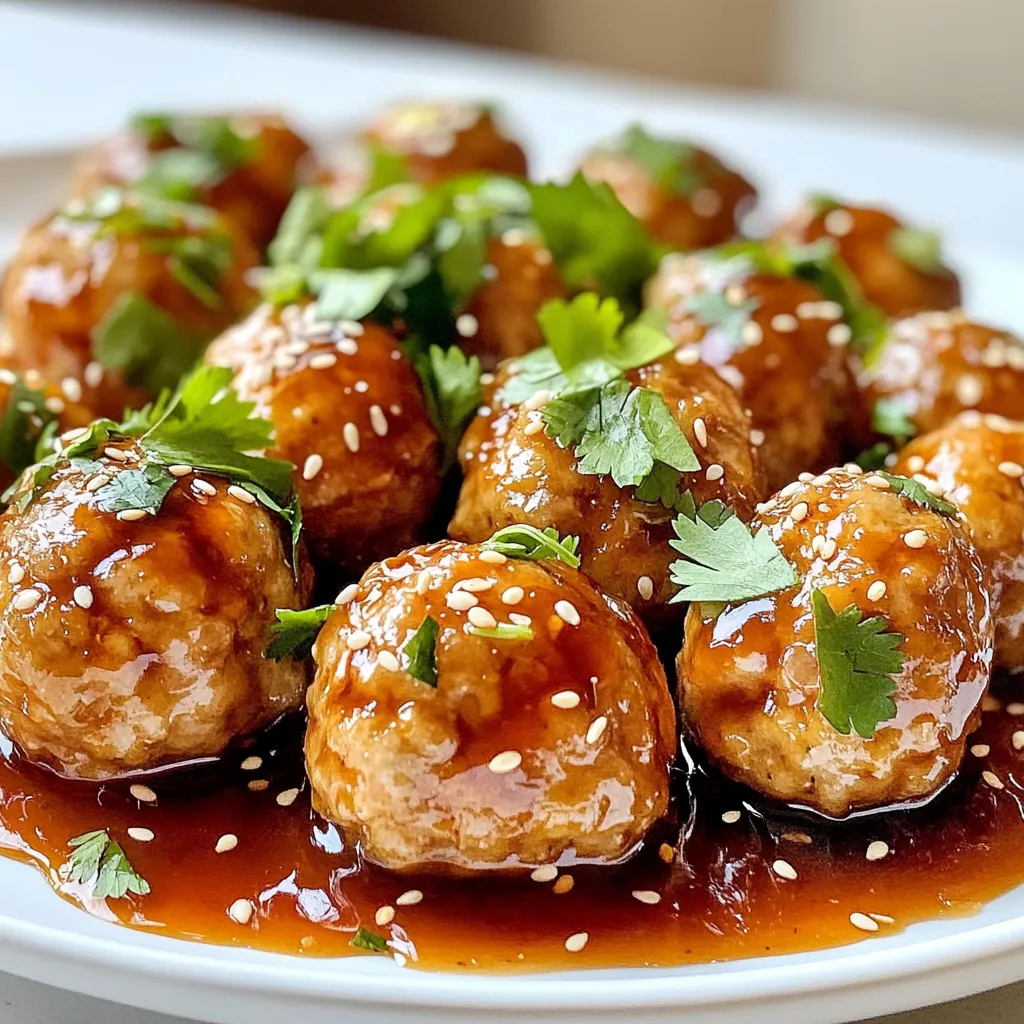 Delicious chicken meatballs coated in a savory teriyaki sauce, garnished with sesame seeds and cilantro.