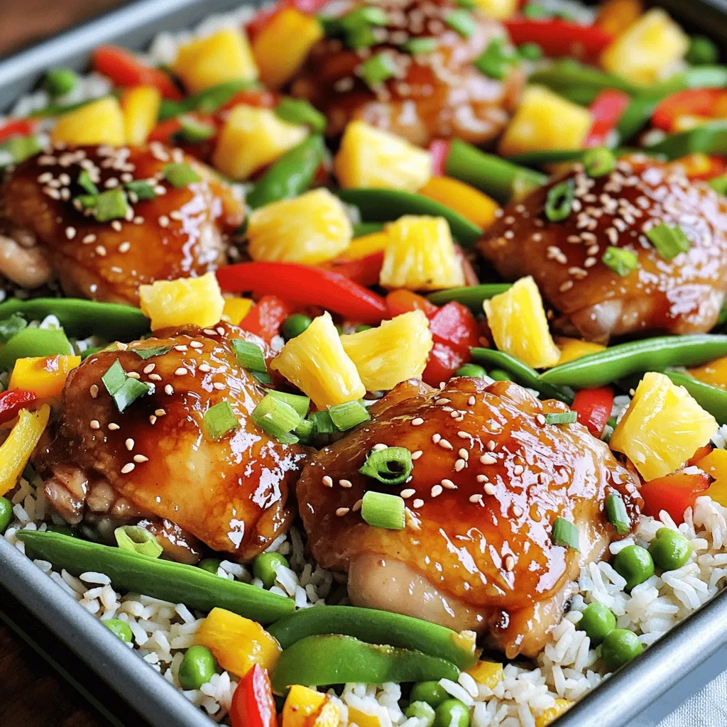 After baking, let the sheet pan cool for a few minutes. Serve the chicken and veggies over the fluffy jasmine rice. Mix in the sweet pineapple for a burst of flavor. Top it off with chopped green onions and toasted sesame seeds for a lovely crunch. Enjoy your meal!