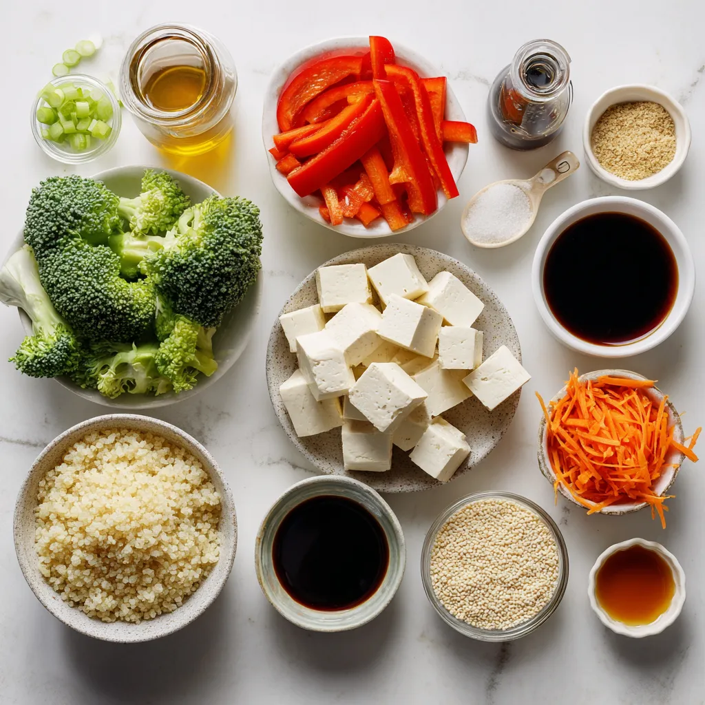 The main ingredients offer a good balance of protein, carbs, and vitamins. Firm tofu gives the dish a hearty base. Cooked quinoa adds fluffy texture and complements the tofu well. Fresh vegetables like broccoli, bell pepper, and carrot add crunch, color, and nutrients.