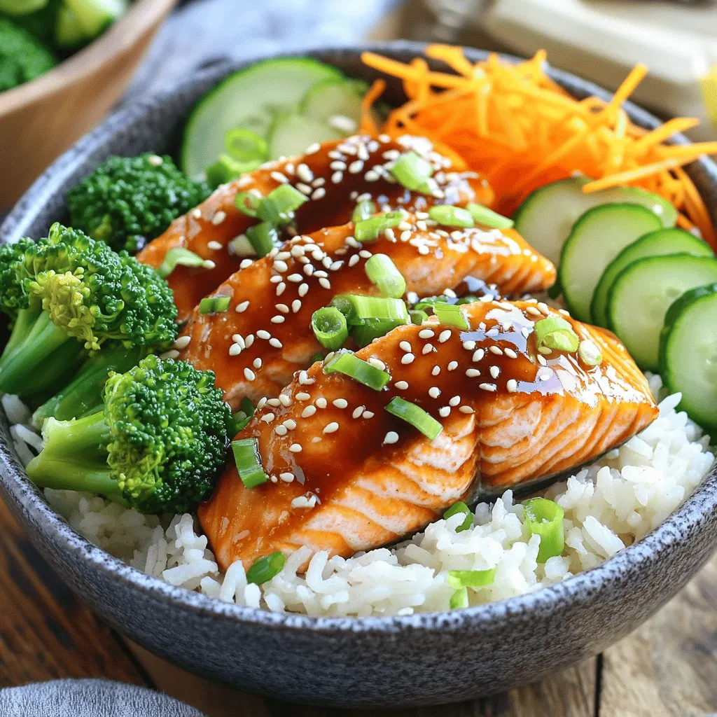 ![To make teriyaki salmon bowls, you need just a few key ingredients. Here’s what you’ll need: - 2 salmon fillets - ¼ cup soy sauce - 2 tablespoons honey - 1 tablespoon rice vinegar - 1 teaspoon sesame oil - 1 tablespoon cornstarch mixed with 1 tablespoon water - 1 cup jasmine rice, cooked - 1 cup steamed broccoli - 1 carrot, shredded - ½ cucumber, thinly sliced - 2 green onions, chopped - Sesame seeds for garnish Each ingredient plays a role in building flavor. The salmon is rich and flaky. The soy sauce gives it a salty, umami taste. Honey adds sweetness, while rice vinegar brings a slight tang. Sesame oil gives a nutty depth. Fresh vegetables make your bowl bright and tasty. Steamed broccoli adds color and crunch. Shredded carrots bring a nice sweetness. Sliced cucumber adds a cool touch. Each bite should feel fresh and vibrant. You can also add other veggies you like, such as bell peppers or snap peas. Garnishes can elevate your bowl. Chopped green onions add a fresh, sharp flavor. A sprinkle of sesame seeds brings a nice crunch. You can even add a drizzle of extra teriyaki sauce for more flavor. These small touches make your dish look and taste gourmet. For the full recipe, check here: [Full Recipe]. To start, grab a small bowl. You will need to mix a few simple ingredients. Combine ¼ cup of soy sauce, 2 tablespoons of honey, 1 tablespoon of rice vinegar, and 1 teaspoon of sesame oil. Now add the cornstarch mixed with 1 tablespoon of water. Whisk these together until smooth. This sauce is the star of your dish. It adds that sweet and savory punch we all love. Next, heat a skillet over medium heat. Place the salmon fillets skin-side down in the skillet. Cook them for about 3-4 minutes. You want the skin to get crispy. After that, flip the fillets carefully. Pour your prepared teriyaki sauce over the salmon. Cook for another 3-4 minutes. Baste the fish with the sauce to keep it moist. The salmon is done when it flakes easily with a fork. Now it's time to put it all together. Start with cooked jasmine rice as your base. Place a serving in each bowl. Next, add steamed broccoli, shredded carrots, and sliced cucumber on top of the rice. Finally, place the teriyaki salmon fillet right in the center. Drizzle some extra teriyaki sauce from the skillet over the salmon for added flavor. Finish off with chopped green onions and a sprinkle of sesame seeds. Your teriyaki salmon bowls are now ready to enjoy! For the complete recipe, refer to the Full Recipe section. Marinades boost the taste of your salmon. A simple mix of soy sauce, honey, and rice vinegar works wonders. Let your salmon soak in this mix for at least 30 minutes. If you’re short on time, even 15 minutes is good. The flavors will soak into the fish, making it rich and tasty. To get that perfect flaky texture, cook your salmon skin-side down first. This keeps the fish moist. Use medium heat and let it cook for 3 to 4 minutes. Flip it gently to avoid breaking it. The salmon should be bright pink inside when done. It should flake easily with a fork. Use cooked jasmine rice to save time. You can also steam broccoli in the microwave. Just a few minutes will keep it bright and crisp. Chop your veggies while the salmon cooks. This way, you’ll have a full meal ready in under 20 minutes. For the full recipe, check out the complete details. {{image_2}} You can easily swap ingredients to fit your diet. If you are gluten-free, use tamari instead of soy sauce. For a lower-carb option, swap jasmine rice for cauliflower rice. For vegans, replace salmon with grilled tofu or tempeh. These changes keep the dish tasty while meeting your needs. Feel free to mix in other vegetables. Snap peas, bell peppers, or bok choy all work well. You can also use sautéed spinach or roasted sweet potatoes for a sweet touch. Adding a rainbow of colors makes your bowl more appealing and adds nutrients. You can try different sauces for new flavors. A spicy sriracha or sweet chili sauce can add a kick. For a tangy twist, use ponzu sauce. Experimenting with sauces makes each bowl unique and fun to eat. Check out the Full Recipe for more ideas! To keep your teriyaki salmon bowls fresh, store them in airtight containers. This will help lock in flavor and moisture. Let the bowls cool down before sealing them. You can keep leftovers in the fridge for up to three days. If you want to save them longer, consider freezing. Reheating is easy and quick. You can use the microwave or a skillet. If using the microwave, place the bowl in for about 1-2 minutes. Stir halfway through to heat evenly. If using a skillet, put the bowl on low heat. Add a splash of water to steam the veggies while warming the salmon. If you plan to freeze your bowls, separate the salmon from the rice and veggies. This keeps everything fresh and tasty. Place the salmon in one container and the rice and veggies in another. Make sure to label them with dates. You can freeze them for up to three months. When ready to eat, thaw them overnight in the fridge before reheating. For the full recipe, check out the details above. Yes, you can use frozen salmon. Just make sure to thaw it first. Place the salmon in the fridge overnight for the best results. If you are short on time, you can also use cold water. Submerge the sealed salmon in water for about an hour. This method helps keep the fish fresh and safe. Many side dishes work well with teriyaki salmon bowls. Here are some ideas: - Steamed edamame - Miso soup - Pickled vegetables - Seaweed salad - Roasted sweet potatoes These sides add more flavor and texture to your meal. To find the best teriyaki salmon bowls, check local food blogs or review sites. Look for restaurants with high ratings and great reviews. You can also ask friends for their recommendations. Many places offer takeout options, making it easy to enjoy this dish from home. If you're feeling adventurous, try making it yourself using the Full Recipe! This article covered everything you need f
